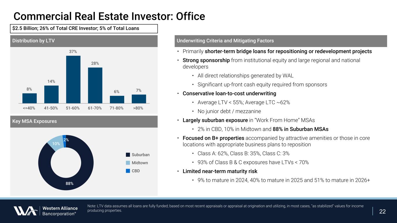 21 Commercial Real Estate Investor Statistics CRE Investor Portfolio ($9.6 billion; 18% of Total Loans) Note: LTV data assumes all loans are fully funded; based on most recent appraisals or appraisal at origination and utilizing, in most cases, “as stabilized” values for income producing properties. Underwriting Criteria and Mitigating Factors Distribution by LTV • Low LTV & LTC (50% to low 60%) range underwriting in areas minimizes tail risk • Simple capital structure - no junior liens or mezzanine debt permitted within our structures • Majority of CRE Investor (bulk of total CRE) is located in our core footprint states • Early elevation, proactive and comprehensive review of CRE portfolio and re-margin discussions with sponsors where sweep/re-margin provisions have been triggered 21% 27% 27% 15% 7% 3% <=40% 41-50% 51-60% 61-70% 71-80% >80% 41% 26% 8% 7% 6% 4% 2% 1% 1% 1% 3% 47% 59% 59% 46% 43% 33% 33% 49% 59% 46% 48% Outstanding LTV Hotel Offi ce Retail Multif amily Industr ial Tim e Share Data Center Senior C are Medical Mini-S torage Other Low uncovered risk with re-margin provisions • Only $638 million of Multi-Family concentrated in western regional markets • No exposure to NYC area Multi-Family Limited Multi-Family Exposure