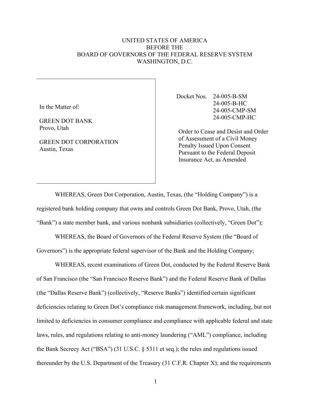 1 UNITED STATES OF AMERICA BEFORE THE BOARD OF GOVERNORS OF THE FEDERAL RESERVE SYSTEM WASHINGTON, D.C. In the Matter of: GREEN DOT BANK Provo, Utah GREEN DOT CORPORATION Austin, Texas Docket Nos. 24-005-B-SM 24-005-B-HC 24-005-CMP-SM 24-005-CMP-HC Order to Cease and Desist and Order of Assessment of a Civil Money Penalty Issued Upon Consent Pursuant to the Federal Deposit Insurance Act, as Amended WHEREAS, Green Dot Corporation, Austin, Texas, (the “Holding Company”) is a registered bank holding company that owns and controls Green Dot Bank, Provo, Utah, (the “Bank”) a state member bank, and various nonbank subsidiaries (collectively, “Green Dot”); WHEREAS, the Board of Governors of the Federal Reserve System (the “Board of Governors”) is the appropriate federal supervisor of the Bank and the Holding Company; WHEREAS, recent examinations of Green Dot, conducted by the Federal Reserve Bank of San Francisco (the “San Francisco Reserve Bank”) and the Federal Reserve Bank of Dallas (the “Dallas Reserve Bank”) (collectively, “Reserve Banks”) identified certain significant deficiencies relating to Green Dot’s compliance risk management framework, including, but not limited to deficiencies in consumer compliance and compliance with applicable federal and state laws, rules, and regulations relating to anti-money laundering (“AML”) compliance, including the Bank Secrecy Act (“BSA”) (31 U.S.C. § 5311 et seq.); the rules and regulations issued thereunder by the U.S. Department of the Treasury (31 C.F.R. Chapter X); and the requirements