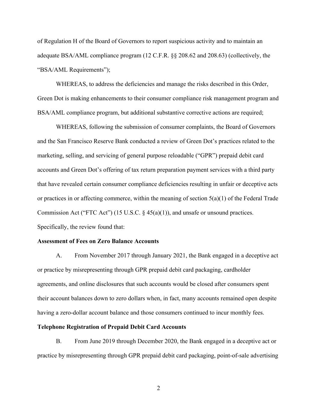 2 of Regulation H of the Board of Governors to report suspicious activity and to maintain an adequate BSA/AML compliance program (12 C.F.R. §§ 208.62 and 208.63) (collectively, the “BSA/AML Requirements”); WHEREAS, to address the deficiencies and manage the risks described in this Order, Green Dot is making enhancements to their consumer compliance risk management program and BSA/AML compliance program, but additional substantive corrective actions are required; WHEREAS, following the submission of consumer complaints, the Board of Governors and the San Francisco Reserve Bank conducted a review of Green Dot’s practices related to the marketing, selling, and servicing of general purpose reloadable (“GPR”) prepaid debit card accounts and Green Dot’s offering of tax return preparation payment services with a third party that have revealed certain consumer compliance deficiencies resulting in unfair or deceptive acts or practices in or affecting commerce, within the meaning of section 5(a)(1) of the Federal Trade Commission Act (“FTC Act”) (15 U.S.C. § 45(a)(1)), and unsafe or unsound practices. Specifically, the review found that: Assessment of Fees on Zero Balance Accounts A. From November 2017 through January 2021, the Bank engaged in a deceptive act or practice by misrepresenting through GPR prepaid debit card packaging, cardholder agreements, and online disclosures that such accounts would be closed after consumers spent their account balances down to zero dollars when, in fact, many accounts remained open despite having a zero-dollar account balance and those consumers continued to incur monthly fees. Telephone Registration of Prepaid Debit Card Accounts B. From June 2019 through December 2020, the Bank engaged in a deceptive act or practice by misrepresenting through GPR prepaid debit card packaging, point-of-sale advertising