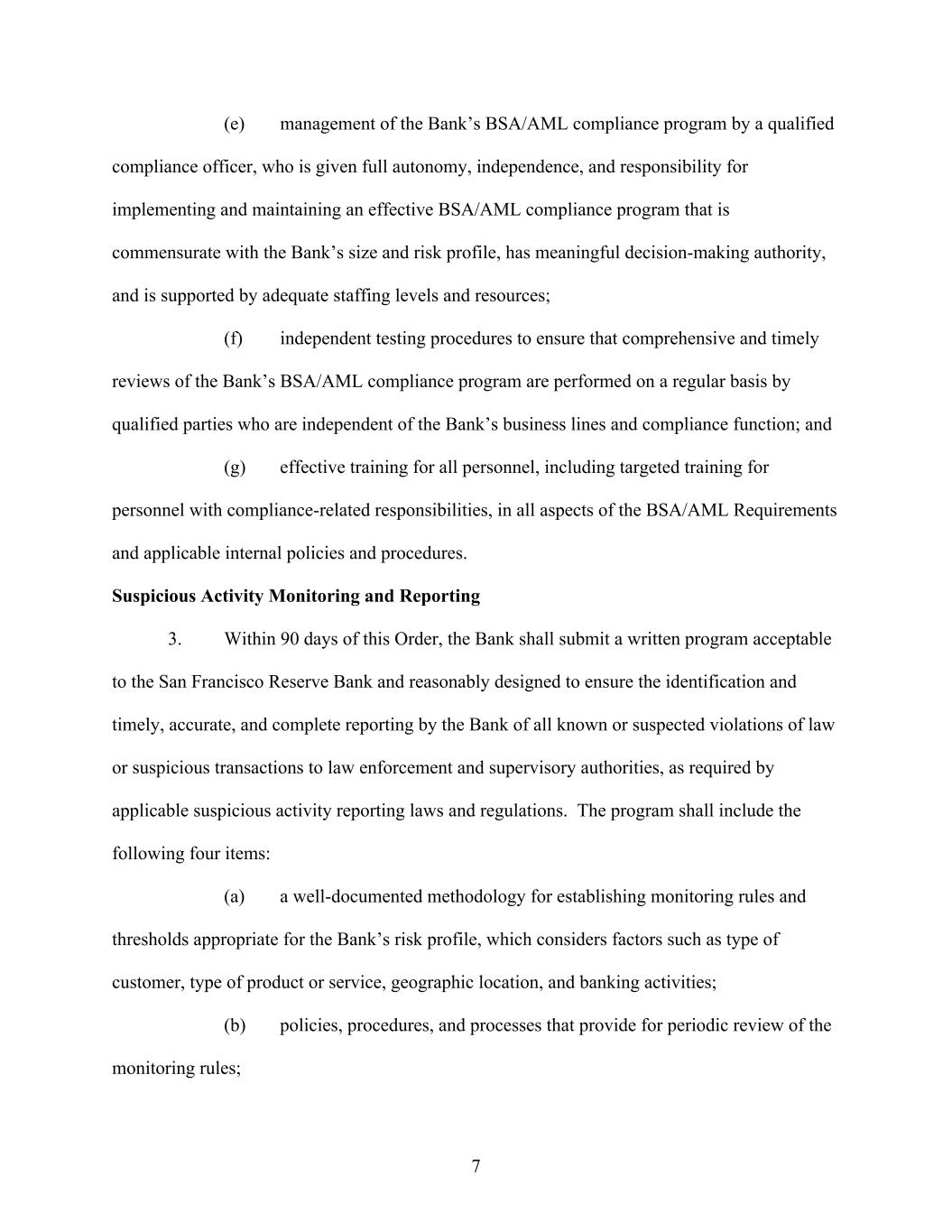7 (e) management of the Bank’s BSA/AML compliance program by a qualified compliance officer, who is given full autonomy, independence, and responsibility for implementing and maintaining an effective BSA/AML compliance program that is commensurate with the Bank’s size and risk profile, has meaningful decision-making authority, and is supported by adequate staffing levels and resources; (f) independent testing procedures to ensure that comprehensive and timely reviews of the Bank’s BSA/AML compliance program are performed on a regular basis by qualified parties who are independent of the Bank’s business lines and compliance function; and (g) effective training for all personnel, including targeted training for personnel with compliance-related responsibilities, in all aspects of the BSA/AML Requirements and applicable internal policies and procedures. Suspicious Activity Monitoring and Reporting 3. Within 90 days of this Order, the Bank shall submit a written program acceptable to the San Francisco Reserve Bank and reasonably designed to ensure the identification and timely, accurate, and complete reporting by the Bank of all known or suspected violations of law or suspicious transactions to law enforcement and supervisory authorities, as required by applicable suspicious activity reporting laws and regulations. The program shall include the following four items: (a) a well-documented methodology for establishing monitoring rules and thresholds appropriate for the Bank’s risk profile, which considers factors such as type of customer, type of product or service, geographic location, and banking activities; (b) policies, procedures, and processes that provide for periodic review of the monitoring rules;