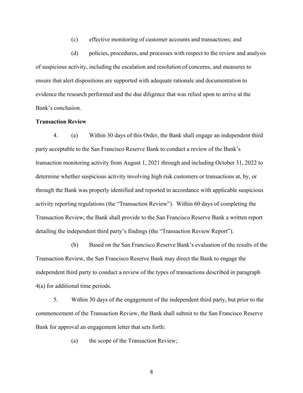8 (c) effective monitoring of customer accounts and transactions; and (d) policies, procedures, and processes with respect to the review and analysis of suspicious activity, including the escalation and resolution of concerns, and measures to ensure that alert dispositions are supported with adequate rationale and documentation to evidence the research performed and the due diligence that was relied upon to arrive at the Bank’s conclusion. Transaction Review 4. (a) Within 30 days of this Order, the Bank shall engage an independent third party acceptable to the San Francisco Reserve Bank to conduct a review of the Bank’s transaction monitoring activity from August 1, 2021 through and including October 31, 2022 to determine whether suspicious activity involving high risk customers or transactions at, by, or through the Bank was properly identified and reported in accordance with applicable suspicious activity reporting regulations (the “Transaction Review”). Within 60 days of completing the Transaction Review, the Bank shall provide to the San Francisco Reserve Bank a written report detailing the independent third party’s findings (the “Transaction Review Report”). (b) Based on the San Francisco Reserve Bank’s evaluation of the results of the Transaction Review, the San Francisco Reserve Bank may direct the Bank to engage the independent third party to conduct a review of the types of transactions described in paragraph 4(a) for additional time periods. 5. Within 30 days of the engagement of the independent third party, but prior to the commencement of the Transaction Review, the Bank shall submit to the San Francisco Reserve Bank for approval an engagement letter that sets forth: (a) the scope of the Transaction Review;
