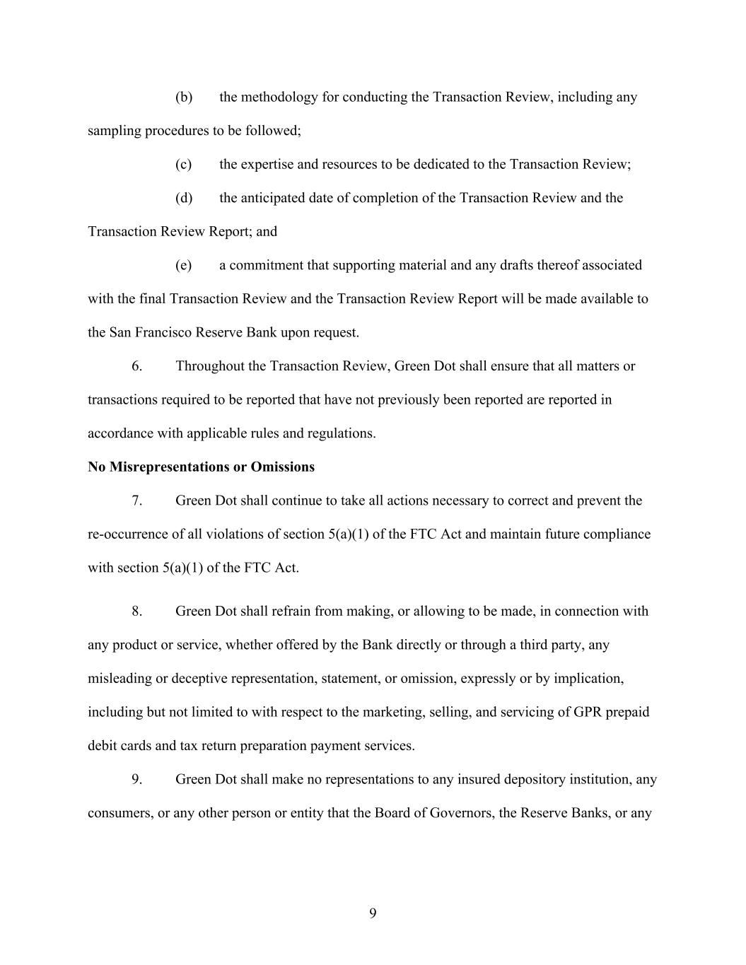 9 (b) the methodology for conducting the Transaction Review, including any sampling procedures to be followed; (c) the expertise and resources to be dedicated to the Transaction Review; (d) the anticipated date of completion of the Transaction Review and the Transaction Review Report; and (e) a commitment that supporting material and any drafts thereof associated with the final Transaction Review and the Transaction Review Report will be made available to the San Francisco Reserve Bank upon request. 6. Throughout the Transaction Review, Green Dot shall ensure that all matters or transactions required to be reported that have not previously been reported are reported in accordance with applicable rules and regulations. No Misrepresentations or Omissions 7. Green Dot shall continue to take all actions necessary to correct and prevent the re-occurrence of all violations of section 5(a)(1) of the FTC Act and maintain future compliance with section 5(a)(1) of the FTC Act. 8. Green Dot shall refrain from making, or allowing to be made, in connection with any product or service, whether offered by the Bank directly or through a third party, any misleading or deceptive representation, statement, or omission, expressly or by implication, including but not limited to with respect to the marketing, selling, and servicing of GPR prepaid debit cards and tax return preparation payment services. 9. Green Dot shall make no representations to any insured depository institution, any consumers, or any other person or entity that the Board of Governors, the Reserve Banks, or any