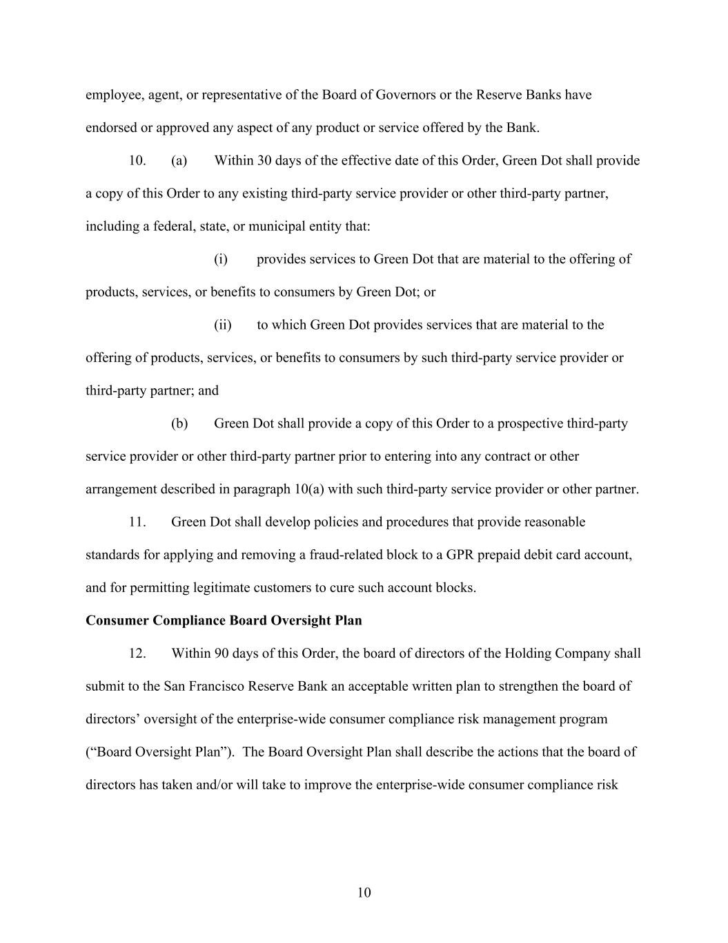 10 employee, agent, or representative of the Board of Governors or the Reserve Banks have endorsed or approved any aspect of any product or service offered by the Bank. 10. (a) Within 30 days of the effective date of this Order, Green Dot shall provide a copy of this Order to any existing third-party service provider or other third-party partner, including a federal, state, or municipal entity that: (i) provides services to Green Dot that are material to the offering of products, services, or benefits to consumers by Green Dot; or (ii) to which Green Dot provides services that are material to the offering of products, services, or benefits to consumers by such third-party service provider or third-party partner; and (b) Green Dot shall provide a copy of this Order to a prospective third-party service provider or other third-party partner prior to entering into any contract or other arrangement described in paragraph 10(a) with such third-party service provider or other partner. 11. Green Dot shall develop policies and procedures that provide reasonable standards for applying and removing a fraud-related block to a GPR prepaid debit card account, and for permitting legitimate customers to cure such account blocks. Consumer Compliance Board Oversight Plan 12. Within 90 days of this Order, the board of directors of the Holding Company shall submit to the San Francisco Reserve Bank an acceptable written plan to strengthen the board of directors’ oversight of the enterprise-wide consumer compliance risk management program (“Board Oversight Plan”). The Board Oversight Plan shall describe the actions that the board of directors has taken and/or will take to improve the enterprise-wide consumer compliance risk