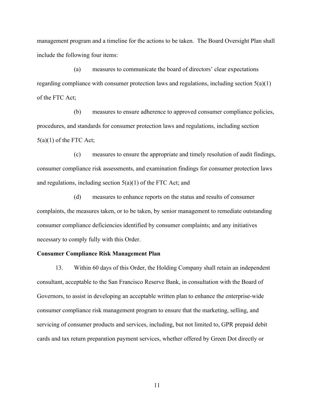 11 management program and a timeline for the actions to be taken. The Board Oversight Plan shall include the following four items: (a) measures to communicate the board of directors’ clear expectations regarding compliance with consumer protection laws and regulations, including section 5(a)(1) of the FTC Act; (b) measures to ensure adherence to approved consumer compliance policies, procedures, and standards for consumer protection laws and regulations, including section 5(a)(1) of the FTC Act; (c) measures to ensure the appropriate and timely resolution of audit findings, consumer compliance risk assessments, and examination findings for consumer protection laws and regulations, including section 5(a)(1) of the FTC Act; and (d) measures to enhance reports on the status and results of consumer complaints, the measures taken, or to be taken, by senior management to remediate outstanding consumer compliance deficiencies identified by consumer complaints; and any initiatives necessary to comply fully with this Order. Consumer Compliance Risk Management Plan 13. Within 60 days of this Order, the Holding Company shall retain an independent consultant, acceptable to the San Francisco Reserve Bank, in consultation with the Board of Governors, to assist in developing an acceptable written plan to enhance the enterprise-wide consumer compliance risk management program to ensure that the marketing, selling, and servicing of consumer products and services, including, but not limited to, GPR prepaid debit cards and tax return preparation payment services, whether offered by Green Dot directly or