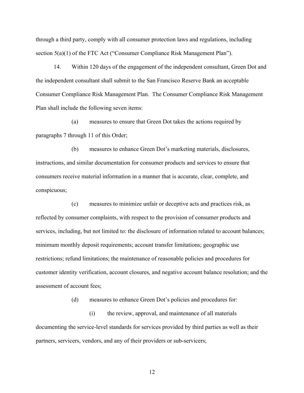 12 through a third party, comply with all consumer protection laws and regulations, including section 5(a)(1) of the FTC Act (“Consumer Compliance Risk Management Plan”). 14. Within 120 days of the engagement of the independent consultant, Green Dot and the independent consultant shall submit to the San Francisco Reserve Bank an acceptable Consumer Compliance Risk Management Plan. The Consumer Compliance Risk Management Plan shall include the following seven items: (a) measures to ensure that Green Dot takes the actions required by paragraphs 7 through 11 of this Order; (b) measures to enhance Green Dot’s marketing materials, disclosures, instructions, and similar documentation for consumer products and services to ensure that consumers receive material information in a manner that is accurate, clear, complete, and conspicuous; (c) measures to minimize unfair or deceptive acts and practices risk, as reflected by consumer complaints, with respect to the provision of consumer products and services, including, but not limited to: the disclosure of information related to account balances; minimum monthly deposit requirements; account transfer limitations; geographic use restrictions; refund limitations; the maintenance of reasonable policies and procedures for customer identity verification, account closures, and negative account balance resolution; and the assessment of account fees; (d) measures to enhance Green Dot’s policies and procedures for: (i) the review, approval, and maintenance of all materials documenting the service-level standards for services provided by third parties as well as their partners, servicers, vendors, and any of their providers or sub-servicers;