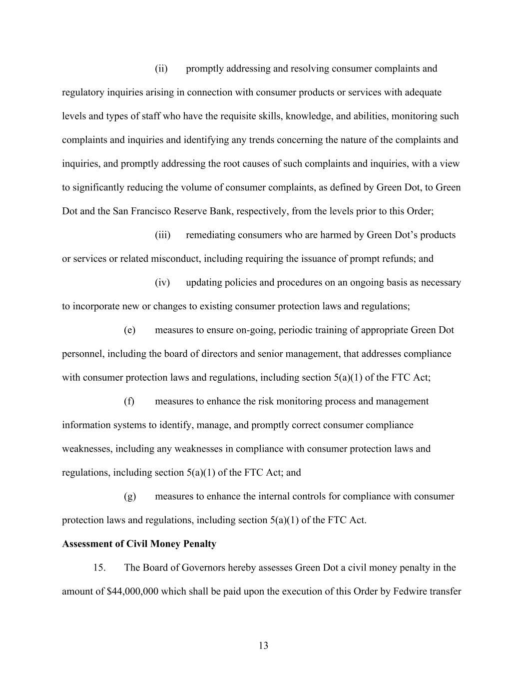 13 (ii) promptly addressing and resolving consumer complaints and regulatory inquiries arising in connection with consumer products or services with adequate levels and types of staff who have the requisite skills, knowledge, and abilities, monitoring such complaints and inquiries and identifying any trends concerning the nature of the complaints and inquiries, and promptly addressing the root causes of such complaints and inquiries, with a view to significantly reducing the volume of consumer complaints, as defined by Green Dot, to Green Dot and the San Francisco Reserve Bank, respectively, from the levels prior to this Order; (iii) remediating consumers who are harmed by Green Dot’s products or services or related misconduct, including requiring the issuance of prompt refunds; and (iv) updating policies and procedures on an ongoing basis as necessary to incorporate new or changes to existing consumer protection laws and regulations; (e) measures to ensure on-going, periodic training of appropriate Green Dot personnel, including the board of directors and senior management, that addresses compliance with consumer protection laws and regulations, including section 5(a)(1) of the FTC Act; (f) measures to enhance the risk monitoring process and management information systems to identify, manage, and promptly correct consumer compliance weaknesses, including any weaknesses in compliance with consumer protection laws and regulations, including section 5(a)(1) of the FTC Act; and (g) measures to enhance the internal controls for compliance with consumer protection laws and regulations, including section 5(a)(1) of the FTC Act. Assessment of Civil Money Penalty 15. The Board of Governors hereby assesses Green Dot a civil money penalty in the amount of $44,000,000 which shall be paid upon the execution of this Order by Fedwire transfer
