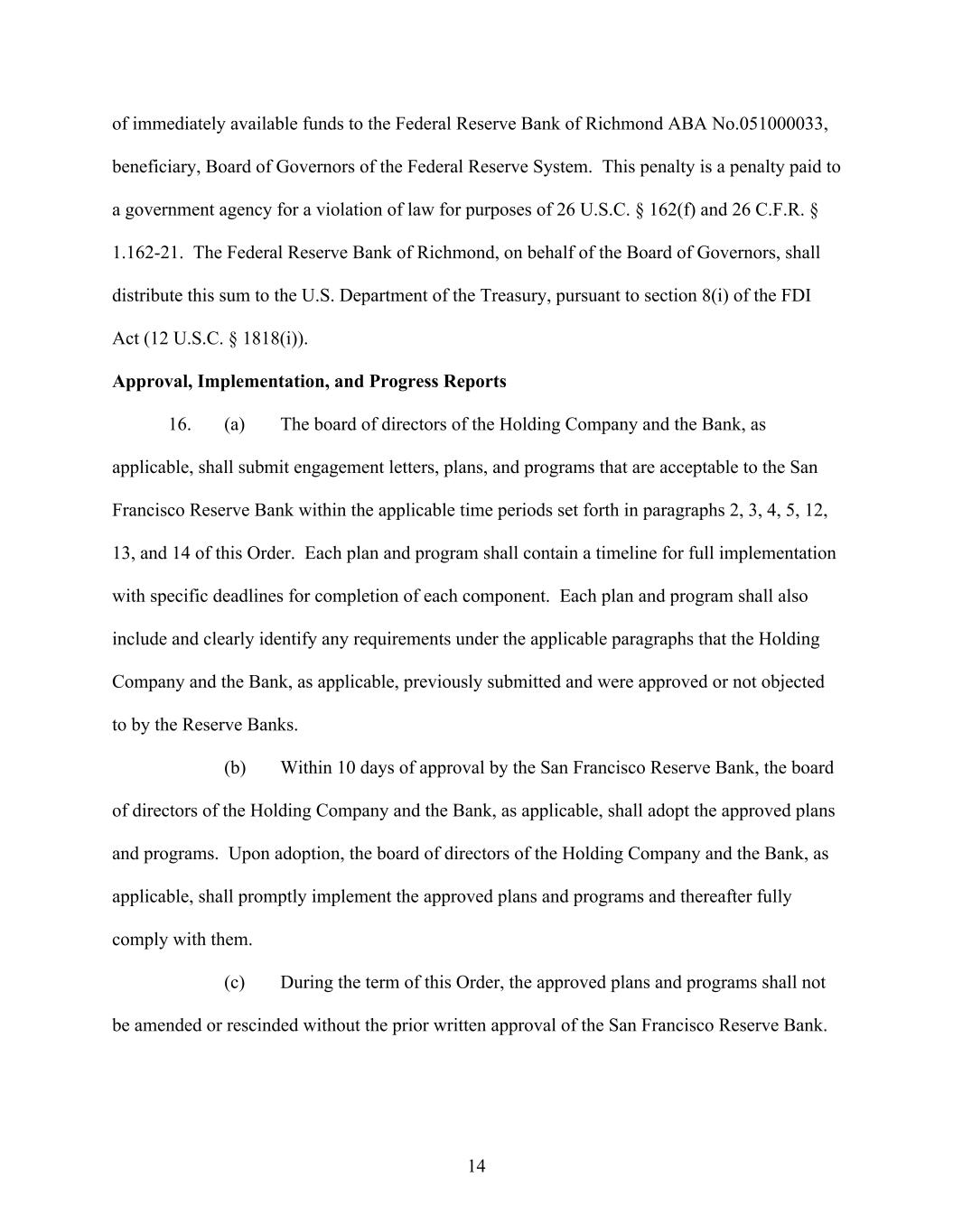 14 of immediately available funds to the Federal Reserve Bank of Richmond ABA No.051000033, beneficiary, Board of Governors of the Federal Reserve System. This penalty is a penalty paid to a government agency for a violation of law for purposes of 26 U.S.C. § 162(f) and 26 C.F.R. § 1.162-21. The Federal Reserve Bank of Richmond, on behalf of the Board of Governors, shall distribute this sum to the U.S. Department of the Treasury, pursuant to section 8(i) of the FDI Act (12 U.S.C. § 1818(i)). Approval, Implementation, and Progress Reports 16. (a) The board of directors of the Holding Company and the Bank, as applicable, shall submit engagement letters, plans, and programs that are acceptable to the San Francisco Reserve Bank within the applicable time periods set forth in paragraphs 2, 3, 4, 5, 12, 13, and 14 of this Order. Each plan and program shall contain a timeline for full implementation with specific deadlines for completion of each component. Each plan and program shall also include and clearly identify any requirements under the applicable paragraphs that the Holding Company and the Bank, as applicable, previously submitted and were approved or not objected to by the Reserve Banks. (b) Within 10 days of approval by the San Francisco Reserve Bank, the board of directors of the Holding Company and the Bank, as applicable, shall adopt the approved plans and programs. Upon adoption, the board of directors of the Holding Company and the Bank, as applicable, shall promptly implement the approved plans and programs and thereafter fully comply with them. (c) During the term of this Order, the approved plans and programs shall not be amended or rescinded without the prior written approval of the San Francisco Reserve Bank.
