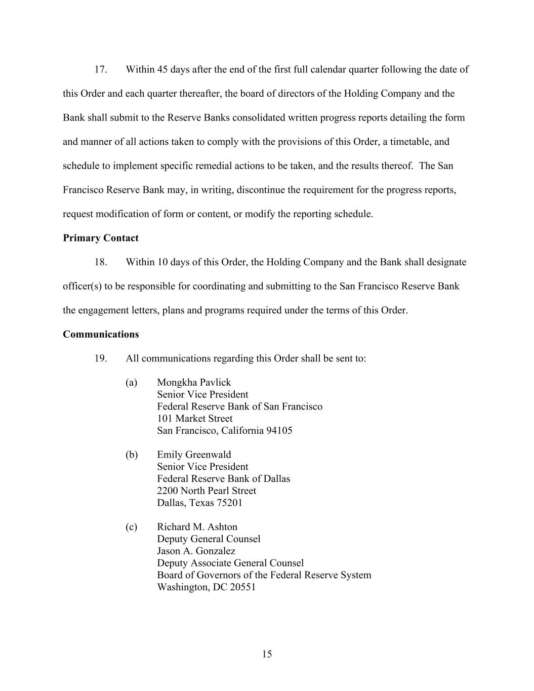 15 17. Within 45 days after the end of the first full calendar quarter following the date of this Order and each quarter thereafter, the board of directors of the Holding Company and the Bank shall submit to the Reserve Banks consolidated written progress reports detailing the form and manner of all actions taken to comply with the provisions of this Order, a timetable, and schedule to implement specific remedial actions to be taken, and the results thereof. The San Francisco Reserve Bank may, in writing, discontinue the requirement for the progress reports, request modification of form or content, or modify the reporting schedule. Primary Contact 18. Within 10 days of this Order, the Holding Company and the Bank shall designate officer(s) to be responsible for coordinating and submitting to the San Francisco Reserve Bank the engagement letters, plans and programs required under the terms of this Order. Communications 19. All communications regarding this Order shall be sent to: (a) Mongkha Pavlick Senior Vice President Federal Reserve Bank of San Francisco 101 Market Street San Francisco, California 94105 (b) Emily Greenwald Senior Vice President Federal Reserve Bank of Dallas 2200 North Pearl Street Dallas, Texas 75201 (c) Richard M. Ashton Deputy General Counsel Jason A. Gonzalez Deputy Associate General Counsel Board of Governors of the Federal Reserve System Washington, DC 20551