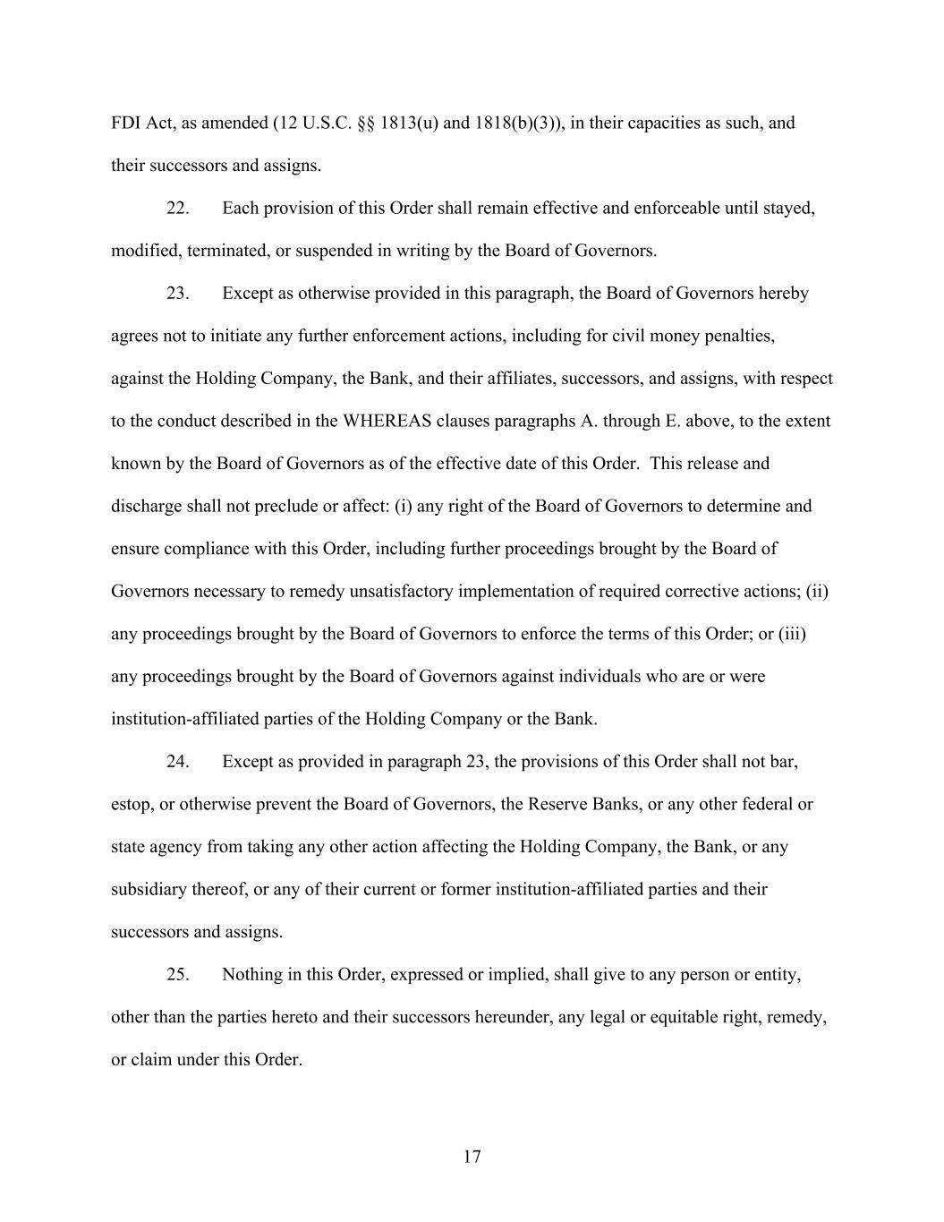 17 FDI Act, as amended (12 U.S.C. §§ 1813(u) and 1818(b)(3)), in their capacities as such, and their successors and assigns. 22. Each provision of this Order shall remain effective and enforceable until stayed, modified, terminated, or suspended in writing by the Board of Governors. 23. Except as otherwise provided in this paragraph, the Board of Governors hereby agrees not to initiate any further enforcement actions, including for civil money penalties, against the Holding Company, the Bank, and their affiliates, successors, and assigns, with respect to the conduct described in the WHEREAS clauses paragraphs A. through E. above, to the extent known by the Board of Governors as of the effective date of this Order. This release and discharge shall not preclude or affect: (i) any right of the Board of Governors to determine and ensure compliance with this Order, including further proceedings brought by the Board of Governors necessary to remedy unsatisfactory implementation of required corrective actions; (ii) any proceedings brought by the Board of Governors to enforce the terms of this Order; or (iii) any proceedings brought by the Board of Governors against individuals who are or were institution-affiliated parties of the Holding Company or the Bank. 24. Except as provided in paragraph 23, the provisions of this Order shall not bar, estop, or otherwise prevent the Board of Governors, the Reserve Banks, or any other federal or state agency from taking any other action affecting the Holding Company, the Bank, or any subsidiary thereof, or any of their current or former institution-affiliated parties and their successors and assigns. 25. Nothing in this Order, expressed or implied, shall give to any person or entity, other than the parties hereto and their successors hereunder, any legal or equitable right, remedy, or claim under this Order.