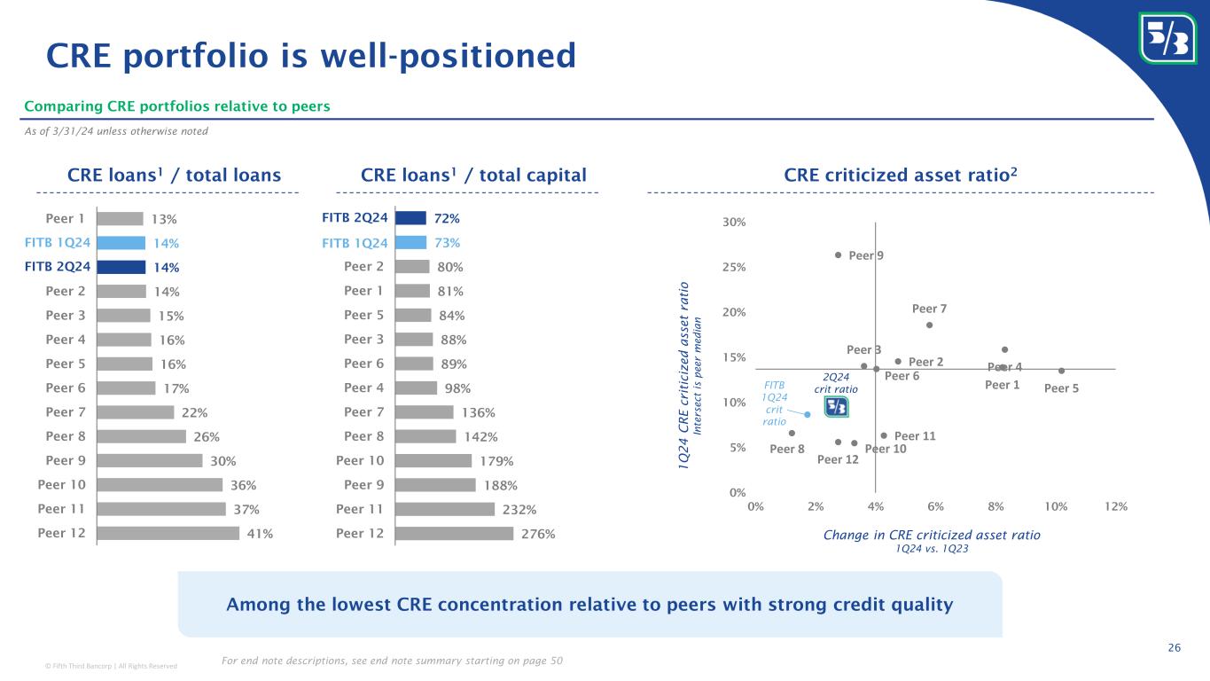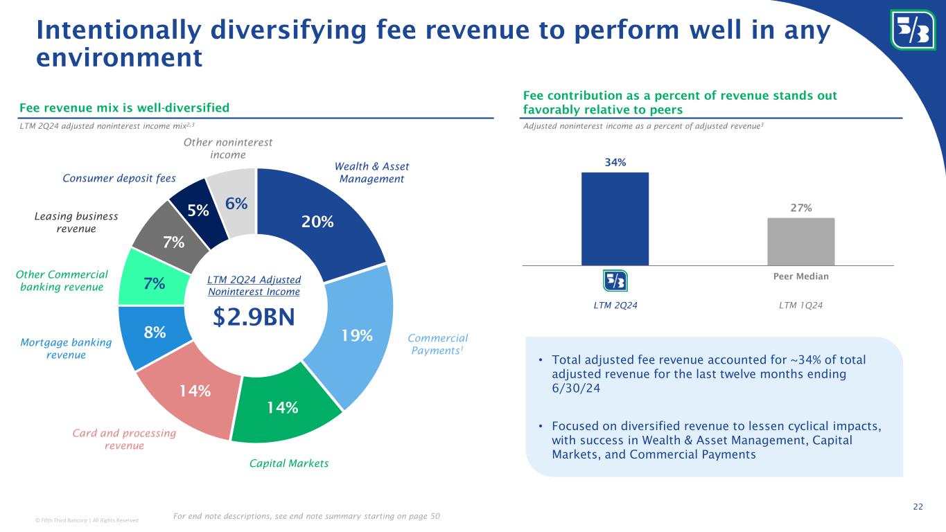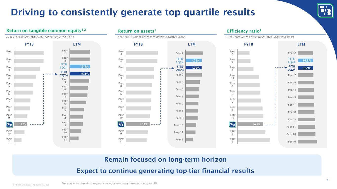 © Fifth Third Bancorp | All Rights Reserved Peer 1 Peer 2 Peer 3 Peer 4 Peer 5 Peer 7 Peer 8 Peer 9 Peer 10 Peer 11 0% 2% 4% 6% 8% 10% (15%) (10%) (5%) 0% 5% 10% 15% Peer 1 Peer 4 Peer 6 Peer 7 Peer 9 Peer 10 Peer 11 0.0% 0.5% 1.0% 1.5% 2.0% 2.5% 3.0% 3.5% (80%) (60%) (40%) (20%) 0% 20% 40% 60% Significant fee scale with strong organic growth 23 Commercial payments business Median is the intersect • Best-in-class product penetration while generating solid growth • Expect strong growth in commercial payments and wealth and asset management businesses through the second half of 2024 4 C a p it a l m a r k e t s h e d g in g r e v e n u e 2 a s a % o f a d j u s t e d r e v e n u e 1 Q 2 4 L T M u n l e s s o t h e r w i s e n o t e d Change in capital markets hedging revenue 2 1Q24 LTM vs. 1Q23 LTM unless otherwise noted Wealth & asset management business Capital markets hedging business Median is the intersect Peer 1 Peer 2 Peer 3 Peer 4 Peer 5 Peer 6 Peer 7 Peer 8 Peer 9 Peer 10 Peer 11 0% 1% 2% 3% 4% 5% 6% (15%) (10%) (5%) 0% 5% 10% 15% 20% C o m m e r c ia l p a y m e n t s r e v e n u e 1 a s a % o f a d j u s t e d r e v e n u e 1 Q 2 4 L T M u n l e s s o t h e r w i s e n o t e d Change in commercial payments revenue 1 1Q24 LTM vs. 1Q23 LTM unless otherwise noted W e a lt h & a s s e t m g m t . r e v e n u e 3 a s a % o f a d j u s t e d r e v e n u e 1 Q 2 4 L T M u n l e s s o t h e r w i s e n o t e d Change in wealth & asset mgmt. revenue 3 1Q24 LTM vs. 1Q23 LTM unless otherwise noted Median is the intersect FITB 1Q24 LTM 2Q24 LTM FITB 1Q24 LTM 2Q24 LTM FITB 1Q24 LTM 2Q24 LTM For end note descriptions, see end note summary starting on page 50