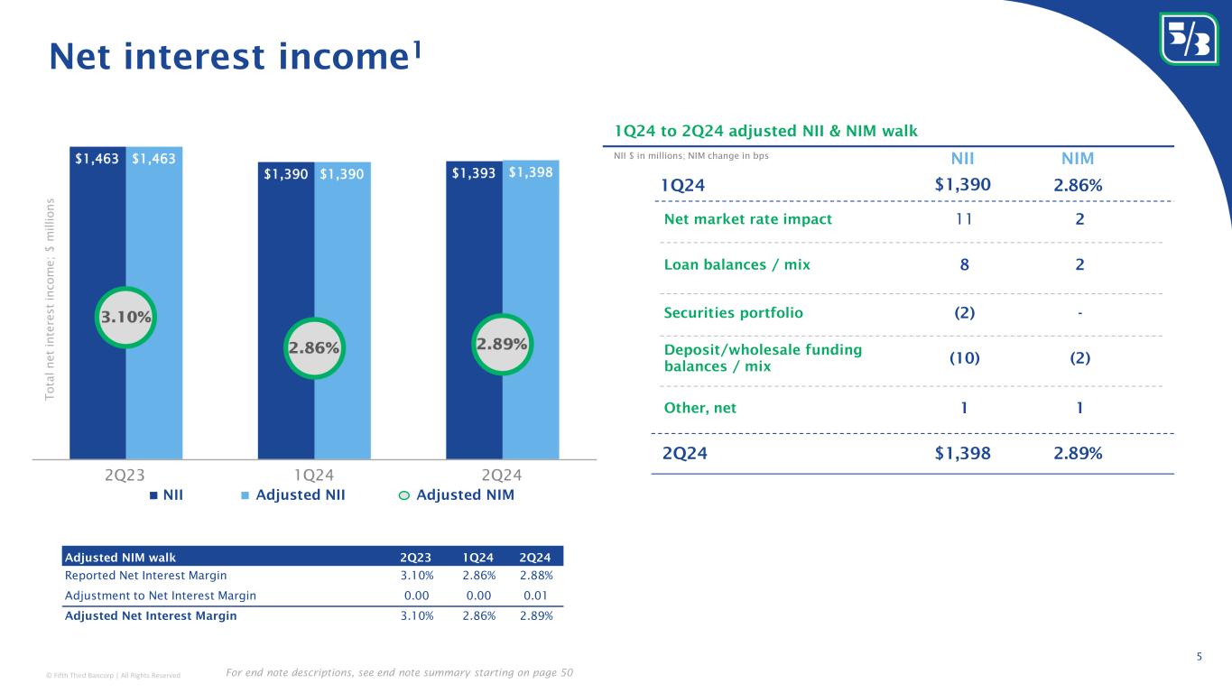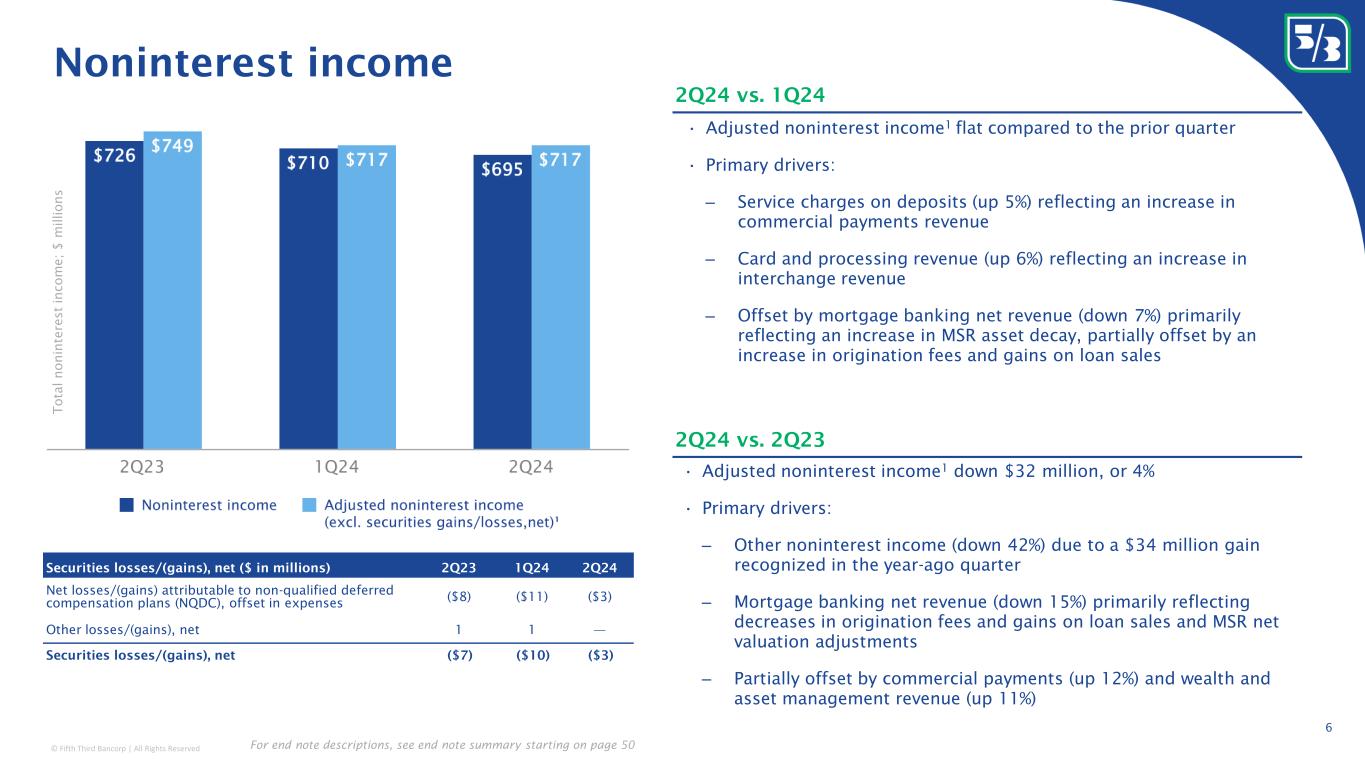 © Fifth Third Bancorp | All Rights Reserved NII $ in millions; NIM change in bps 1Q24 to 2Q24 adjusted NII & NIM walk T o t a l n e t in t e r e s t i n c o m e ; $ m il li o n s NII Adjusted NIM For end note descriptions, see end note summary starting on page 50 NII $1,3901Q24 2.86% NIM $1,398 2.89%2Q24 Securities portfolio Loan balances / mix (2) - 8 2 11 2Net market rate impact Deposit/wholesale funding balances / mix (10) (2) Net interest income 1 11 5 Other, net Adjusted NII Adjusted NIM walk 2Q23 1Q24 2Q24 Reported Net Interest Margin 3.10% 2.86% 2.88% Adjustment to Net Interest Margin 0.00 0.00 0.01 Adjusted Net Interest Margin 3.10% 2.86% 2.89%