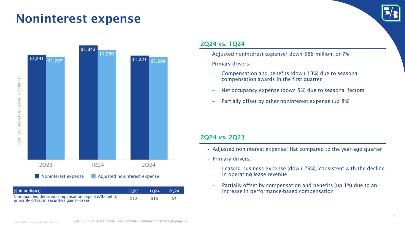 © Fifth Third Bancorp | All Rights Reserved • Adjusted noninterest income 1 flat compared to the prior quarter • Primary drivers: ‒ Service charges on deposits (up 5%) reflecting an increase in commercial payments revenue ‒ Card and processing revenue (up 6%) reflecting an increase in interchange revenue ‒ Offset by mortgage banking net revenue (down 7%) primarily reflecting an increase in MSR asset decay, partially offset by an increase in origination fees and gains on loan sales • Adjusted noninterest income 1 down $32 million, or 4% • Primary drivers: ‒ Other noninterest income (down 42%) due to a $34 million gain recognized in the year-ago quarter ‒ Mortgage banking net revenue (down 15%) primarily reflecting decreases in origination fees and gains on loan sales and MSR net valuation adjustments ‒ Partially offset by commercial payments (up 12%) and wealth and asset management revenue (up 11%) Noninterest income 2Q24 vs. 2Q23 2Q24 vs. 1Q24 For end note descriptions, see end note summary starting on page 50 T o t a l n o n in t e r e s t i n c o m e ; $ m il li o n s Securities losses/(gains), net ($ in millions) 2Q23 1Q24 2Q24 Net losses/(gains) attributable to non-qualified deferred compensation plans (NQDC), offset in expenses ($8) ($11) ($3) Other losses/(gains), net 1 1 — Securities losses/(gains), net ($7) ($10) ($3) 6