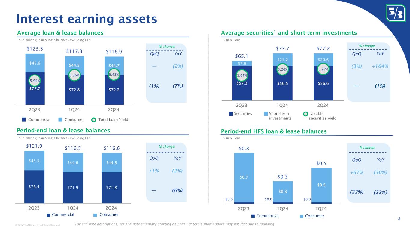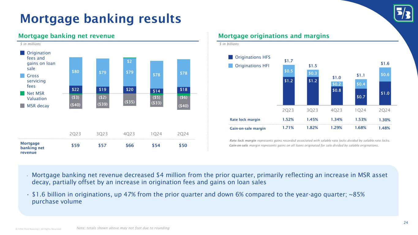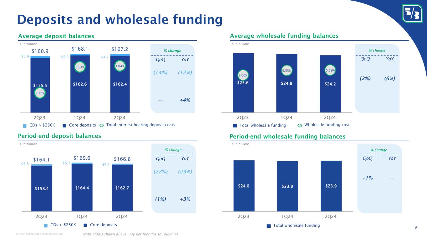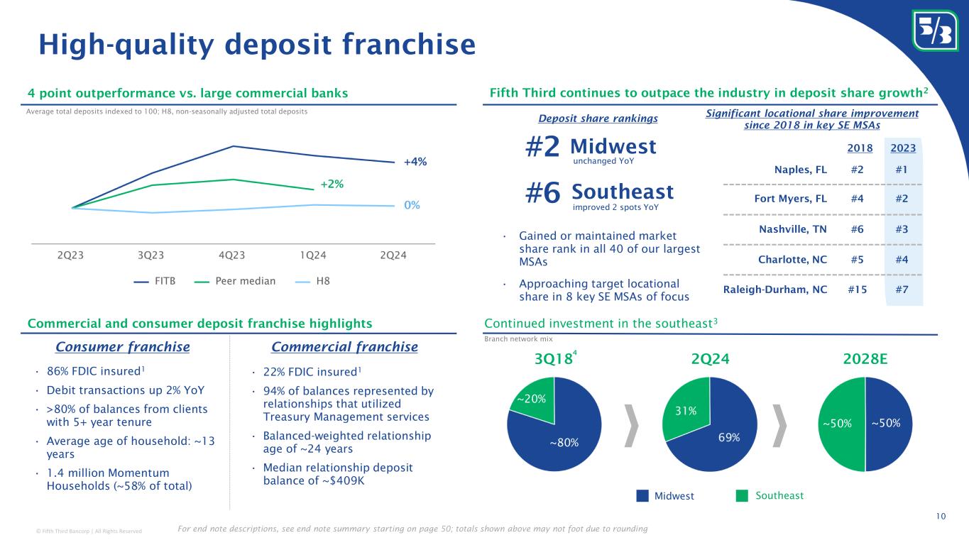 | | 2Q24 | 1Q24 | 2Q23 | Stability: •Continued repricing benefit on fixed rate loan portfolio and moderating deposit costs drove increased net interest income and net interest margin compared to prior quarter •Strong profitability resulted in CET1 increasing to 10.60% while also executing $125 million share repurchase •Fifth consecutive quarter of CRE NCO ratio below 1 bp Profitability: •Strong fee performance in wealth and asset management revenue (up 11%) and commercial payments revenue (up 12%) compared to 2Q23 •Interest-bearing core deposit costs up only 4 bps compared to 1Q24 •Disciplined expense management; expenses decreased 1% compared to 2Q23 Growth: •Generated consumer household growth of 3% compared to 2Q23, including 6% in the Southeast •Fifth Third Wealth Advisors grew assets under management over 50% to $1.7 billion