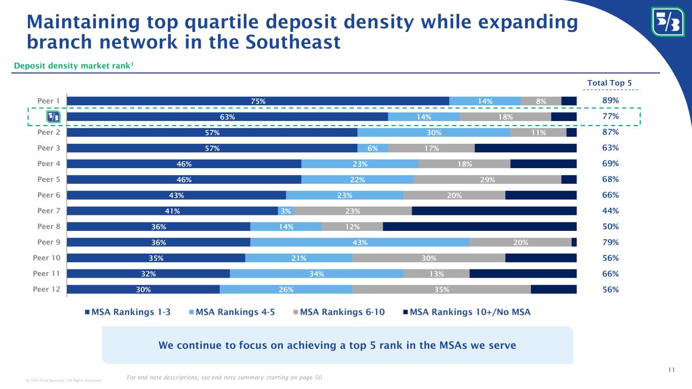 © Fifth Third Bancorp | All Rights Reserved • 86% FDIC insured 1 • Debit transactions up 2% YoY • >80% of balances from clients with 5+ year tenure • Average age of household: ~13 years • 1.4 million Momentum Households (~58% of total) High-quality deposit franchise 4 point outperformance vs. large commercial banks Average total deposits indexed to 100; H8, non-seasonally adjusted total deposits Commercial and consumer deposit franchise highlights Continued investment in the southeast 3 For end note descriptions, see end note summary starting on page 50; totals shown above may not foot due to rounding 10 3Q18 2028E Midwest Southeast Commercial franchiseConsumer franchise Fifth Third continues to outpace the industry in deposit share growth 2 +4% 0% +2% #2 #6 Midwest Southeast unchanged YoY improved 2 spots YoY • Gained or maintained market share rank in all 40 of our largest MSAs • Approaching target locational share in 8 key SE MSAs of focus Significant locational share improvement since 2018 in key SE MSAs Deposit share rankings Naples, FL 2018 2023 Nashville, TN Fort Myers, FL Charlotte, NC Raleigh-Durham, NC #2 #6 #4 #5 #15 #1 #3 #2 #4 #7 2Q24 ~50% ~50% ~20% ~80% Branch network mix 4 • 22% FDIC insured 1 • 94% of balances represented by relationships that utilized Treasury Management services • Balanced-weighted relationship age of ~24 years • Median relationship deposit balance of ~$409K