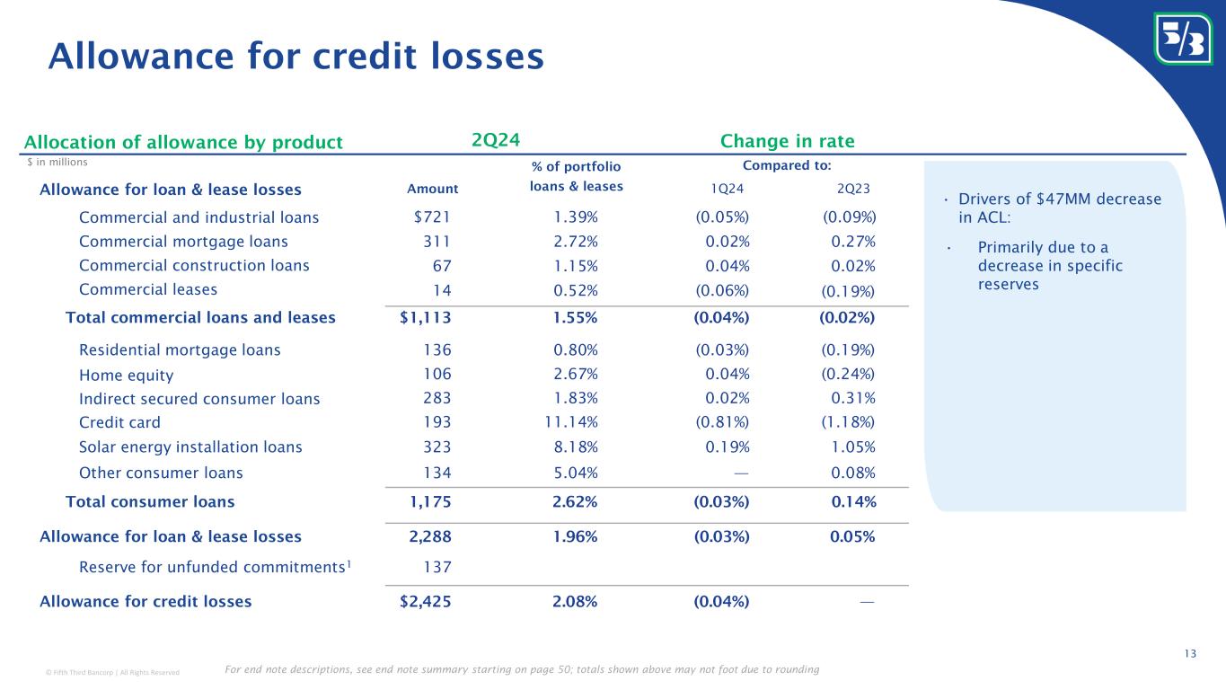© Fifth Third Bancorp | All Rights Reserved For end note descriptions, see end note summary starting on page 50 Credit quality overview 12 Key metrics 2Q23 3Q23 4Q23 1Q24 2Q24 NPL ratio 0.52% 0.47% 0.55% 0.61% 0.52% NPA ratio 1 0.54% 0.51% 0.59% 0.64% 0.55% 30-89 days past due as a % of portfolio loans and leases 0.28% 0.26% 0.31% 0.29% 0.26% NCO ratio 0.29% 0.41% 0.32% 0.38% 0.49% ACL ratio as a % of portfolio loans and leases 2.08% 2.11% 2.12% 2.12% 2.08% $ in millions