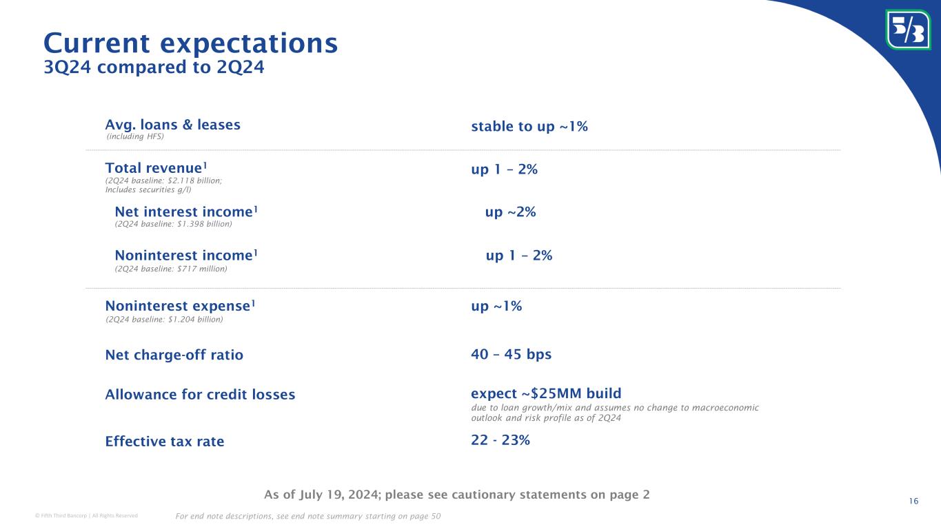 © Fifth Third Bancorp | All Rights Reserved down 2 – 4% Noninterest expense 1 stable (FY23 baseline: $4.937 billion) Net charge-off ratio 35 – 45 bps Effective tax rate ~22% For end note descriptions, see end note summary starting on page 50 As of July 19, 2024; please see cautionary statements on page 2 Total revenue 1 down ~2% (FY23 baseline: $8.826 billion; Includes securities g/l) (including HFS) Avg. loans & leases down ~3% Current expectations FY 2024 compared to FY 2023 15 Allowance for credit losses expect $0 - $10MM release due to loan growth/mix and assumes no change to macroeconomic outlook and risk profile as of 2Q24 Net interest income 1 Noninterest income 1 stable to down ~1% (FY23 baseline: $5.852 billion) (FY23 baseline: $2.956 billion)