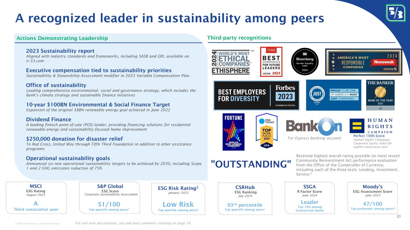 © Fifth Third Bancorp | All Rights Reserved 20 Addressing climate change Promoting inclusion and diversity Demonstrating our commitment to employees Strengthening our communities Keeping the customer at the center >$209MM in lending, investments, and philanthropy towards Empowering Black Futures Neighborhood Investment Program 3,8 >$370MM provided in community development lending and investment >$7.6MM in total charitable giving 9 >41K hours of community service "Outstanding" rating on most recent Community Reinvestment Act performance evaluation from the Office of the Comptroller of Currency 10 Slight decrease in overall turnover from 16.9% in 4Q23 to 16.6% in 2Q24 Enhanced our Employee Stock Purchase Plan (ESPP), allowing eligible employees to buy shares with a 15% Bank match Initiated an Employee Viewpoints Check-in in 2Q24. Fifth Third is committed to monitoring the employee experience, with a focus on career growth and development Enhanced the Development Planning tool within Workday; the first of many to help employees map their career journey >6.7MM customer outreach calls in 1H24, continuing our heightened connection to the customer 3.0% YoY consumer checking household growth Low reliance on consumer fees, with consumers avoiding $31.4MM in overdraft fees in 1H24 with Extra Time ® >$17.8BN deposited up to 2 days early in 1H24 with Early Pay® >$22MM in consumer cash back rewards with 5/3 Cash/Back cards in 1H24 ~$3.7BN in lending, investments, financial accessibility and philanthropy towards $2.8BN AREEI initiative 2 44% board diversity 4 57% women; 29% persons of color in workforce Minorities are paid at parity to non- minorities, women are paid 99% of what men are paid 7 >$33MM Tier 1 diverse supplier spend, 7.4% of net addressable spend 9 >1K members in employee Sustainability Business Resource Group >$39BN in sustainable financing towards $100BN goal 1 54% reduction in Scope 1 and 2 GHG emissions since 2014 7 100% renewable power purchased since 2019 7 Offsetting carbon emissions in our operations since 2020 5 $500MM inaugural Green Bond issued in October 2021 6 Fifth Third is committed to supporting customers, communities and employees Sustainability priorities and metrics For end note descriptions, see end note summary starting on page 50