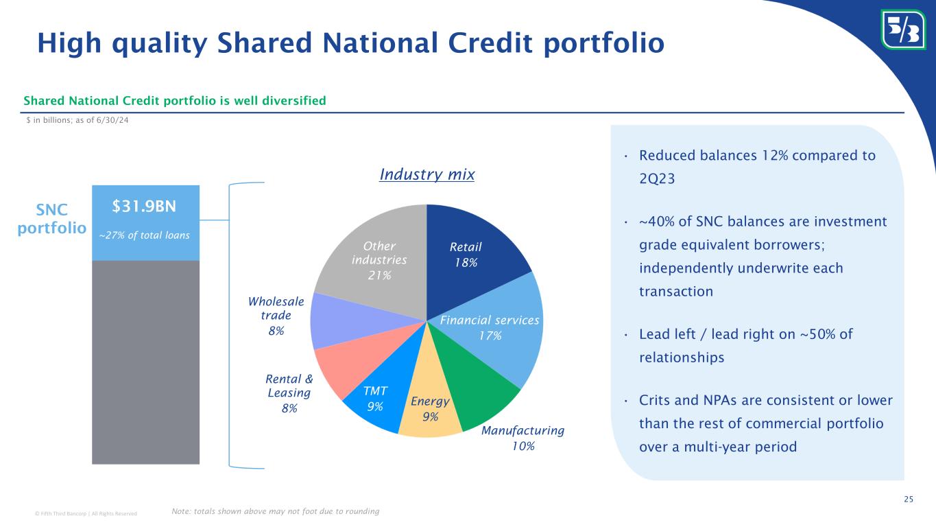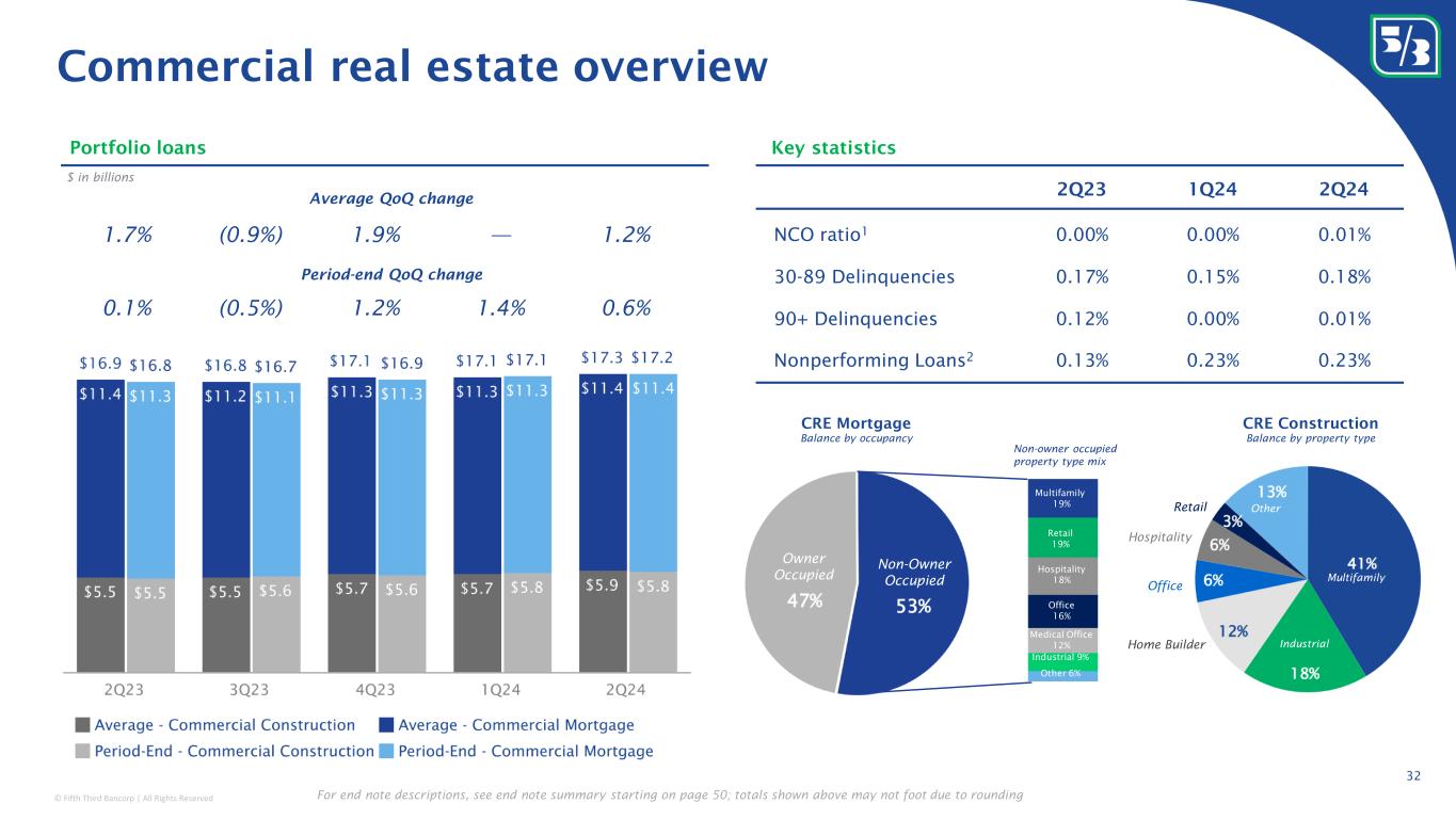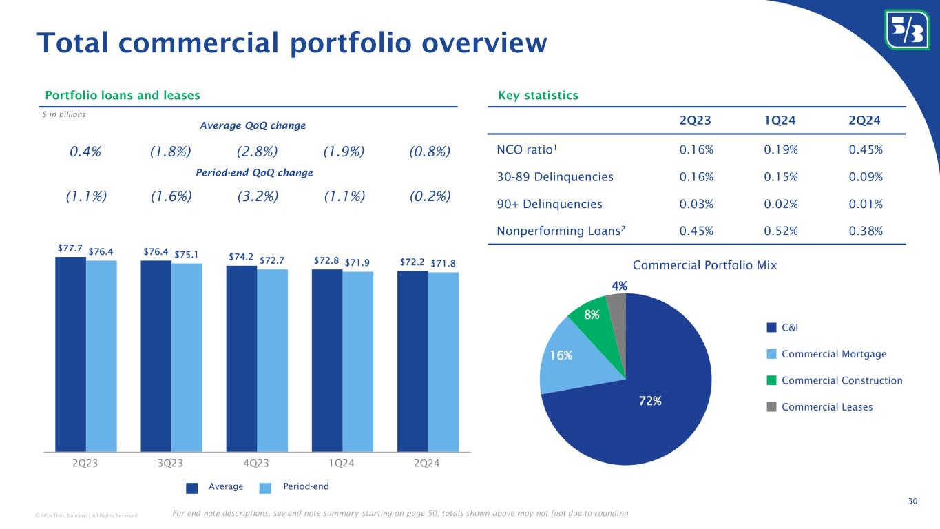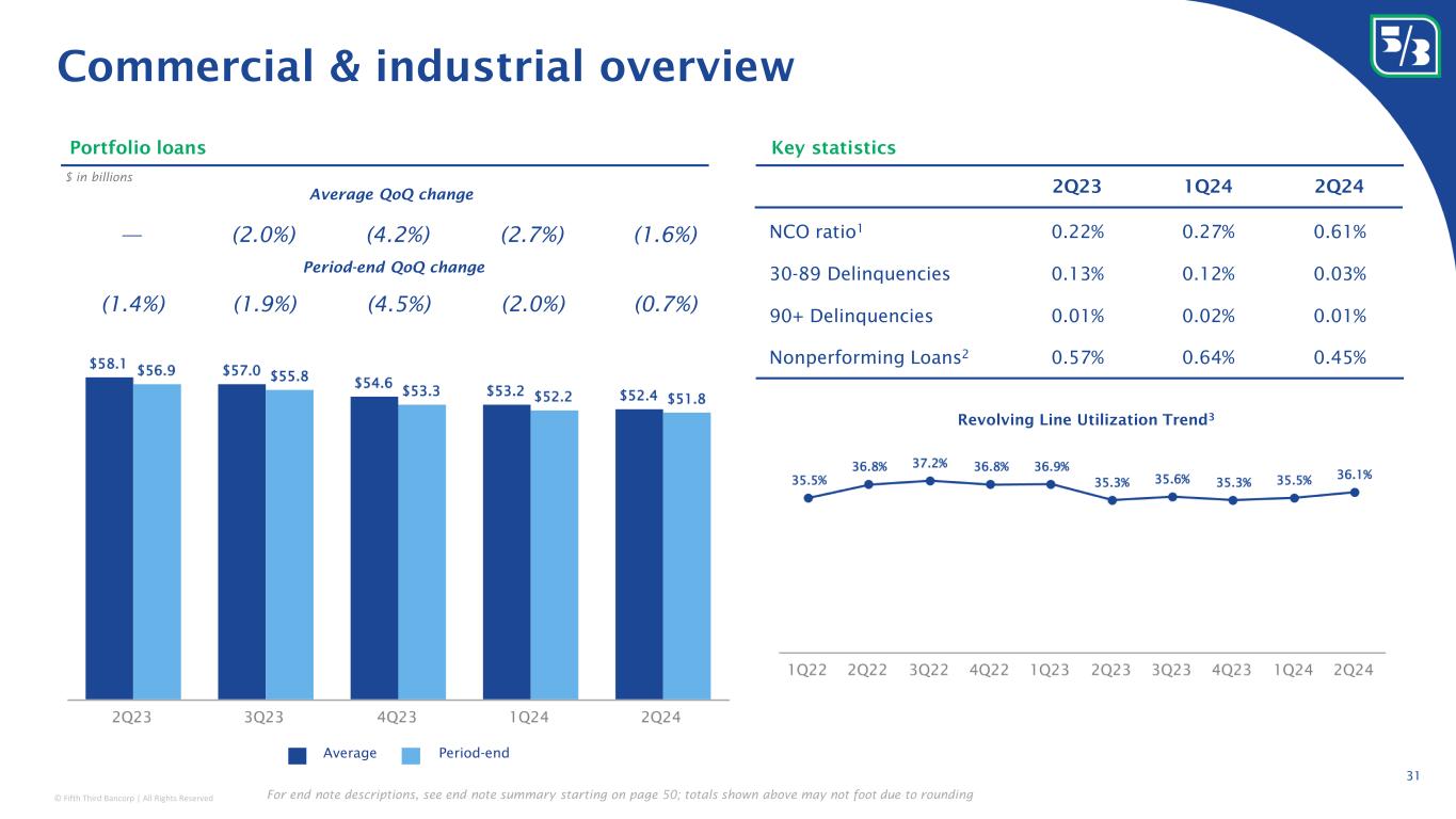 © Fifth Third Bancorp | All Rights Reserved 2Q23 1Q24 2Q24 NCO ratio 1 0.16% 0.19% 0.45% 30-89 Delinquencies 0.16% 0.15% 0.09% 90+ Delinquencies 0.03% 0.02% 0.01% Nonperforming Loans 2 0.45% 0.52% 0.38% 30 Portfolio loans and leases $ in billions Period-end QoQ change Average QoQ change Key statistics Total commercial portfolio overview For end note descriptions, see end note summary starting on page 50; totals shown above may not foot due to rounding 0.4% (1.8%) (2.8%) (1.9%) (0.8%) (1.1%) (1.6%) (3.2%) (1.1%) (0.2%) Period-endAverage