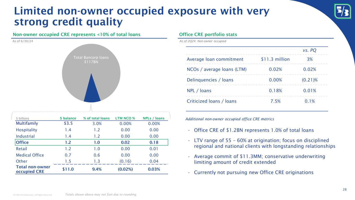 © Fifth Third Bancorp | All Rights Reserved 2Q23 1Q24 2Q24 NCO ratio 1 0.00% 0.00% 0.01% 30-89 Delinquencies 0.17% 0.15% 0.18% 90+ Delinquencies 0.12% 0.00% 0.01% Nonperforming Loans 2 0.13% 0.23% 0.23% Commercial real estate overview CRE Mortgage Balance by occupancy CRE Construction Balance by property type Portfolio loans Key statistics Period-end QoQ change Average QoQ change For end note descriptions, see end note summary starting on page 50; totals shown above may not foot due to rounding $ in billions 0.1% (0.5%) 1.2% 1.4% 0.6% 1.7% (0.9%) 1.9% — 1.2% Multifamily OtherRetail Hospitality Office IndustrialHome Builder Non-Owner Occupied Owner Occupied Multifamily 19% Retail 19% Hospitality 18% Office 16% Medical Office 12% Industrial 9% Non-owner occupied property type mix 32 Other 6%