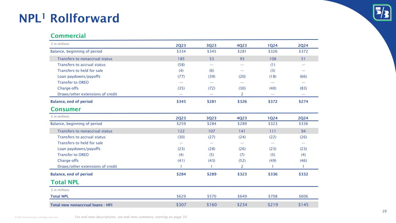 © Fifth Third Bancorp | All Rights Reserved 2Q23 3Q23 4Q23 1Q24 2Q24 Balance, beginning of period $334 $345 $281 $326 $372 Transfers to nonaccrual status 185 53 93 108 51 Transfers to accrual status (58) — — (1) — Transfers to held for sale (4) (6) — (3) — Loan paydowns/payoffs (77) (39) (20) (18) (66) Transfer to OREO — — — — — Charge-offs (35) (72) (30) (40) (83) Draws/other extensions of credit — — 2 — — Balance, end of period $345 $281 $326 $372 $274 2Q23 3Q23 4Q23 1Q24 2Q24 Balance, beginning of period $259 $284 $289 $323 $336 Transfers to nonaccrual status 122 107 141 111 94 Transfers to accrual status (30) (27) (24) (22) (26) Transfers to held for sale — — — — — Loan paydowns/payoffs (23) (28) (26) (23) (23) Transfer to OREO (4) (5) (7) (5) (4) Charge-offs (41) (43) (52) (49) (46) Draws/other extensions of credit 1 1 2 1 1 Balance, end of period $284 $289 $323 $336 $332 NPL 1 Rollforward Commercial Consumer $ in millions $ in millions $ in millions For end note descriptions, see end note summary starting on page 50 29 Total NPL $629 $570 $649 $708 $606 Total new nonaccrual loans - HFI $307 $160 $234 $219 $145 Total NPL