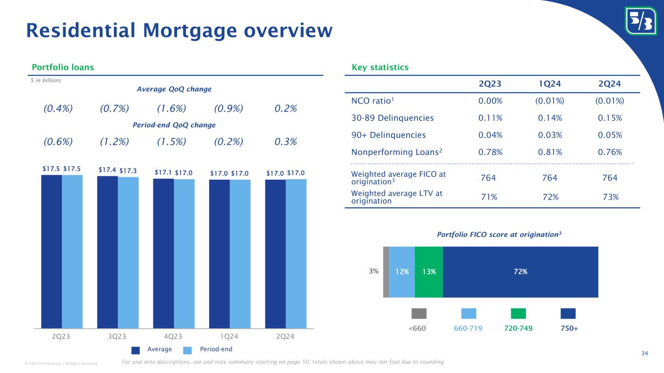 © Fifth Third Bancorp | All Rights Reserved 2Q23 1Q24 2Q24 NCO ratio 1 0.50% 0.67% 0.57% 30-89 Delinquencies 0.48% 0.52% 0.52% 90+ Delinquencies 0.05% 0.05% 0.06% Nonperforming Loans 2 0.62% 0.75% 0.74% Weighted average FICO at origination 3 765 766 766 Weighted average LTV at origination 78% 78% 79% Total consumer portfolio overview 33 Portfolio FICO score at origination 3 $ in billions Portfolio loans Key statistics Period-end QoQ change Average QoQ change For end note descriptions, see end note summary starting on page 50; totals shown above may not foot due to rounding 0.5% (0.7%) (1.4%) (0.2%) 0.3% (0.2%) (1.2%) (1.1%) 0.2% 0.5% 750+720-749<660 660-719 2% Period-endAverage