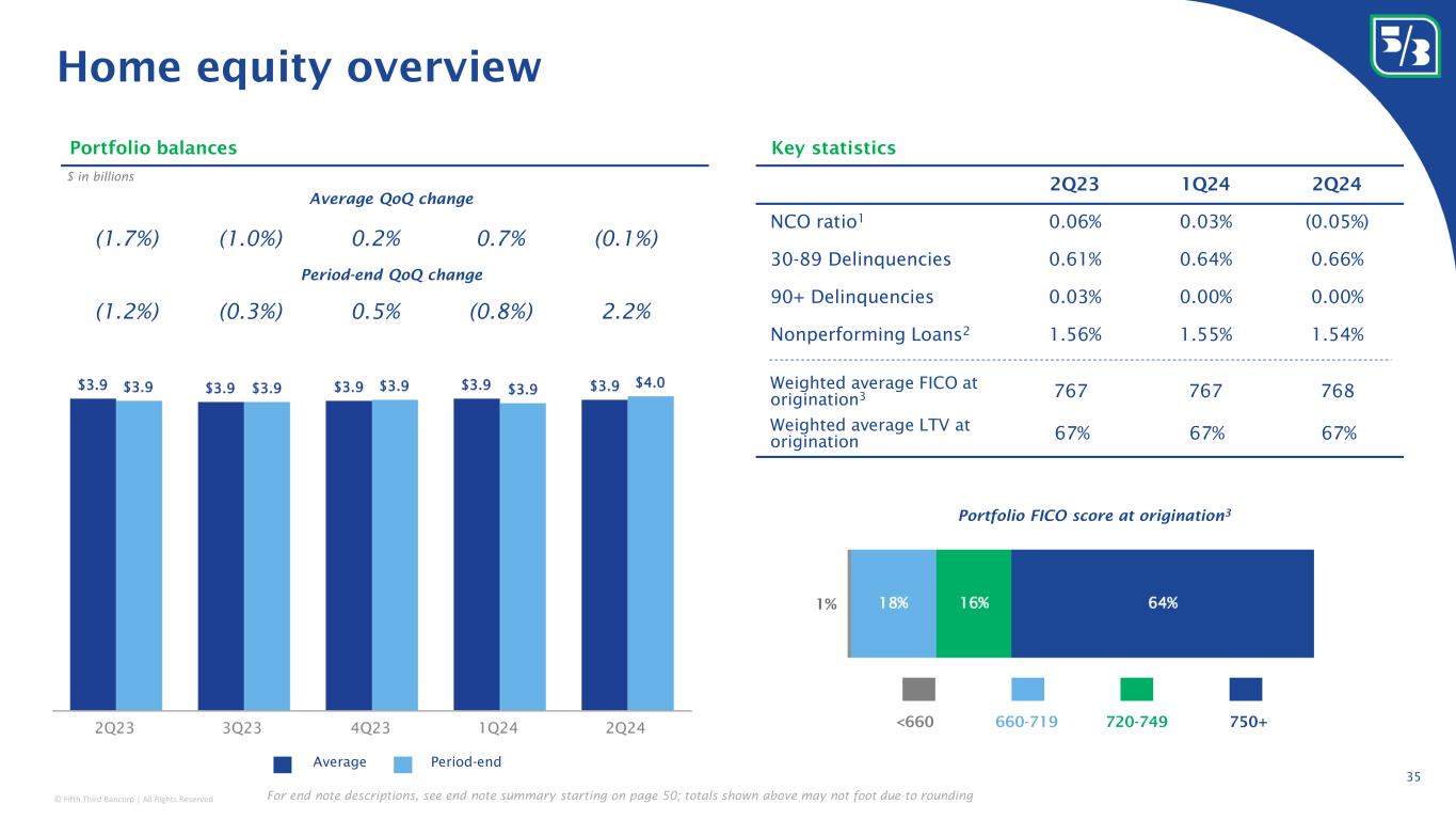 © Fifth Third Bancorp | All Rights Reserved 2Q23 1Q24 2Q24 NCO ratio 1 0.00% (0.01%) (0.01%) 30-89 Delinquencies 0.11% 0.14% 0.15% 90+ Delinquencies 0.04% 0.03% 0.05% Nonperforming Loans 2 0.78% 0.81% 0.76% Weighted average FICO at origination 3 764 764 764 Weighted average LTV at origination 71% 72% 73% Residential Mortgage overview 34 Portfolio FICO score at origination 3 $ in billions Portfolio loans Key statistics Period-end QoQ change Average QoQ change For end note descriptions, see end note summary starting on page 50; totals shown above may not foot due to rounding (0.4%) (0.7%) (1.6%) (0.9%) 0.2% (0.6%) (1.2%) (1.5%) (0.2%) 0.3% 750+720-749<660 660-719 3% Period-endAverage