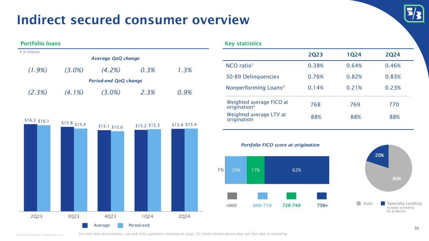 © Fifth Third Bancorp | All Rights Reserved 2Q23 1Q24 2Q24 NCO ratio 1 0.06% 0.03% (0.05%) 30-89 Delinquencies 0.61% 0.64% 0.66% 90+ Delinquencies 0.03% 0.00% 0.00% Nonperforming Loans 2 1.56% 1.55% 1.54% Weighted average FICO at origination 3 767 767 768 Weighted average LTV at origination 67% 67% 67% Home equity overview 35 Portfolio FICO score at origination 3 $ in billions Portfolio balances Key statistics Period-end QoQ change Average QoQ change For end note descriptions, see end note summary starting on page 50; totals shown above may not foot due to rounding (1.7%) (1.0%) 0.2% 0.7% (0.1%) (1.2%) (0.3%) 0.5% (0.8%) 2.2% 750+720-749<660 660-719 1% Period-endAverage