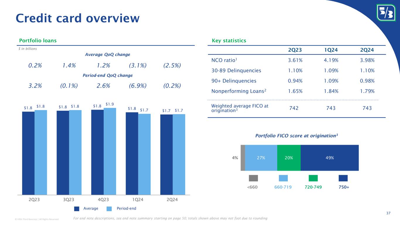 © Fifth Third Bancorp | All Rights Reserved 2Q23 1Q24 2Q24 NCO ratio 1 0.38% 0.64% 0.46% 30-89 Delinquencies 0.76% 0.82% 0.83% Nonperforming Loans 2 0.14% 0.21% 0.23% Indirect secured consumer overview 36 Portfolio FICO score at origination Includes primarily RV & Marine $ in billions Portfolio loans Key statistics Period-end QoQ change Average QoQ change For end note descriptions, see end note summary starting on page 50; totals shown above may not foot due to rounding 1% (1.9%) (3.0%) (4.2%) 0.3% 1.3% (2.3%) (4.1%) (3.0%) 2.3% 0.9% 750+720-749<660 660-719 Period-endAverage Weighted average FICO at origination 3 768 769 770 Weighted average LTV at origination 88% 88% 88%