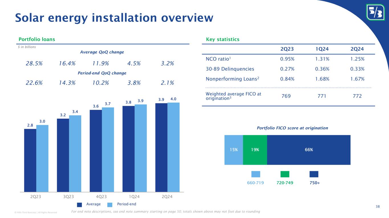 © Fifth Third Bancorp | All Rights Reserved 2Q23 1Q24 2Q24 NCO ratio 1 3.61% 4.19% 3.98% 30-89 Delinquencies 1.10% 1.09% 1.10% 90+ Delinquencies 0.94% 1.09% 0.98% Nonperforming Loans 2 1.65% 1.84% 1.79% Credit card overview 37 Portfolio FICO score at origination 3 750+720-749<660 660-719 $ in billions Portfolio loans Key statistics Period-end QoQ change Average QoQ change For end note descriptions, see end note summary starting on page 50; totals shown above may not foot due to rounding 0.2% 1.4% 1.2% (3.1%) (2.5%) 3.2% (0.1%) 2.6% (6.9%) (0.2%) Weighted average FICO at origination 3 742 743 743 4% Period-endAverage