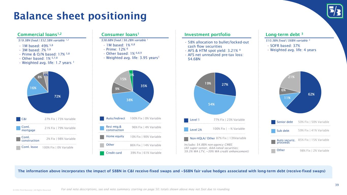 © Fifth Third Bancorp | All Rights Reserved • 58% allocation to bullet/locked-out cash flow securities • AFS & HTM spot yield: 3.21% 4 • AFS net unrealized pre-tax loss: $4.6BN $19.3BN fixed | $52.5BN variable 1,2 Commercial loans 1,2 Balance sheet positioning 100% Fix | —% Variable 87% Fix | 13%Variable Investment portfolioConsumer loans 1 Long-term debt 3 $38.6BN fixed | $6.2BN variable 1 $10.3BN fixed | $6BN variable 3 • 1M based: 49% 5,8 • 3M based: 7% 5,8 • Prime & O/N based: 17% 5,8 • Other based: 1% 5,7,8 • Weighted avg. life: 1.7 years 1 • 1M based: 1% 6,8 • Prime: 12% 6 • Other based: 1% 6,8,9 • Weighted avg. life: 3.95 years 1 • SOFR based: 37% • Weighted avg. life: 4 years C&I 27% Fix | 73% Variable Coml. mortgage 21% Fix | 79% Variable Coml. lease 100% Fix | 0% Variable Resi mtg.& construction 96% Fix | 4% Variable Home equity 10% Fix | 90% Variable Senior debt 50% Fix | 50% Variable Sub debt 59% Fix | 41% Variable Auto securiz. proceeds 85% Fix | 15% Variable Coml. construction 2% Fix | 98% Variable Credit card 39% Fix | 61% Variable Other 86% Fix | 14% Variable Other 98% Fix | 2% Variable Level 1 77% Fix | 23% Variable Level 2A Non-HQLA/ Other Includes $4.8BN non-agency CMBS (All super-senior, AAA-rated securities; 59.3% WA LTV, ~39% WA credit enhancement) Auto/Indirect 100% Fix | 0% Variable For end note descriptions, see end note summary starting on page 50; totals shown above may not foot due to rounding 39 The information above incorporates the impact of $8BN in C&I receive-fixed swaps and ~$6BN fair value hedges associated with long-term debt (receive-fixed swaps)