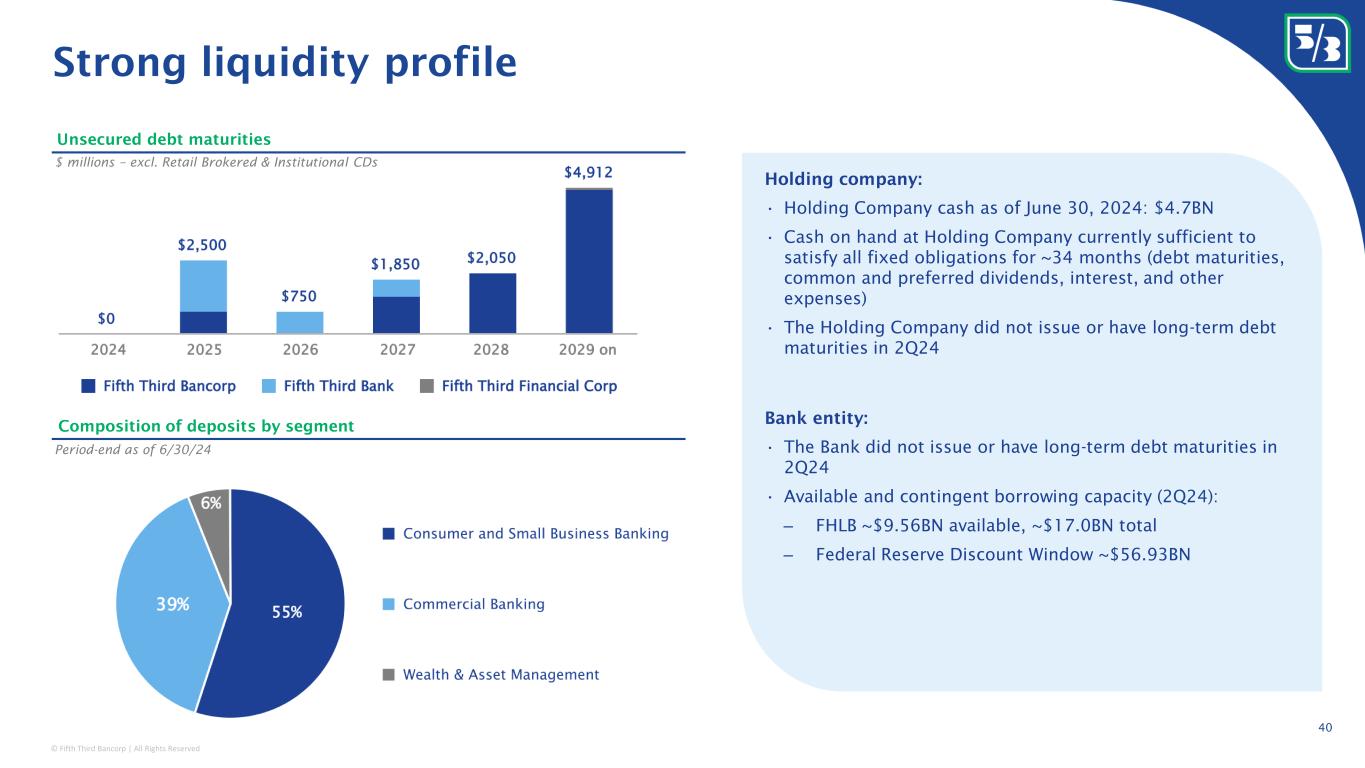 © Fifth Third Bancorp | All Rights Reserved 40 Unsecured debt maturities Composition of deposits by segment Holding company: • Holding Company cash as of June 30, 2024: $4.7BN • Cash on hand at Holding Company currently sufficient to satisfy all fixed obligations for ~34 months (debt maturities, common and preferred dividends, interest, and other expenses) • The Holding Company did not issue or have long-term debt maturities in 2Q24 Bank entity: • The Bank did not issue or have long-term debt maturities in 2Q24 • Available and contingent borrowing capacity (2Q24): ‒ FHLB ~$9.56BN available, ~$17.0BN total ‒ Federal Reserve Discount Window ~$56.93BN Period-end as of 6/30/24 Strong liquidity profile $ millions – excl. Retail Brokered & Institutional CDs