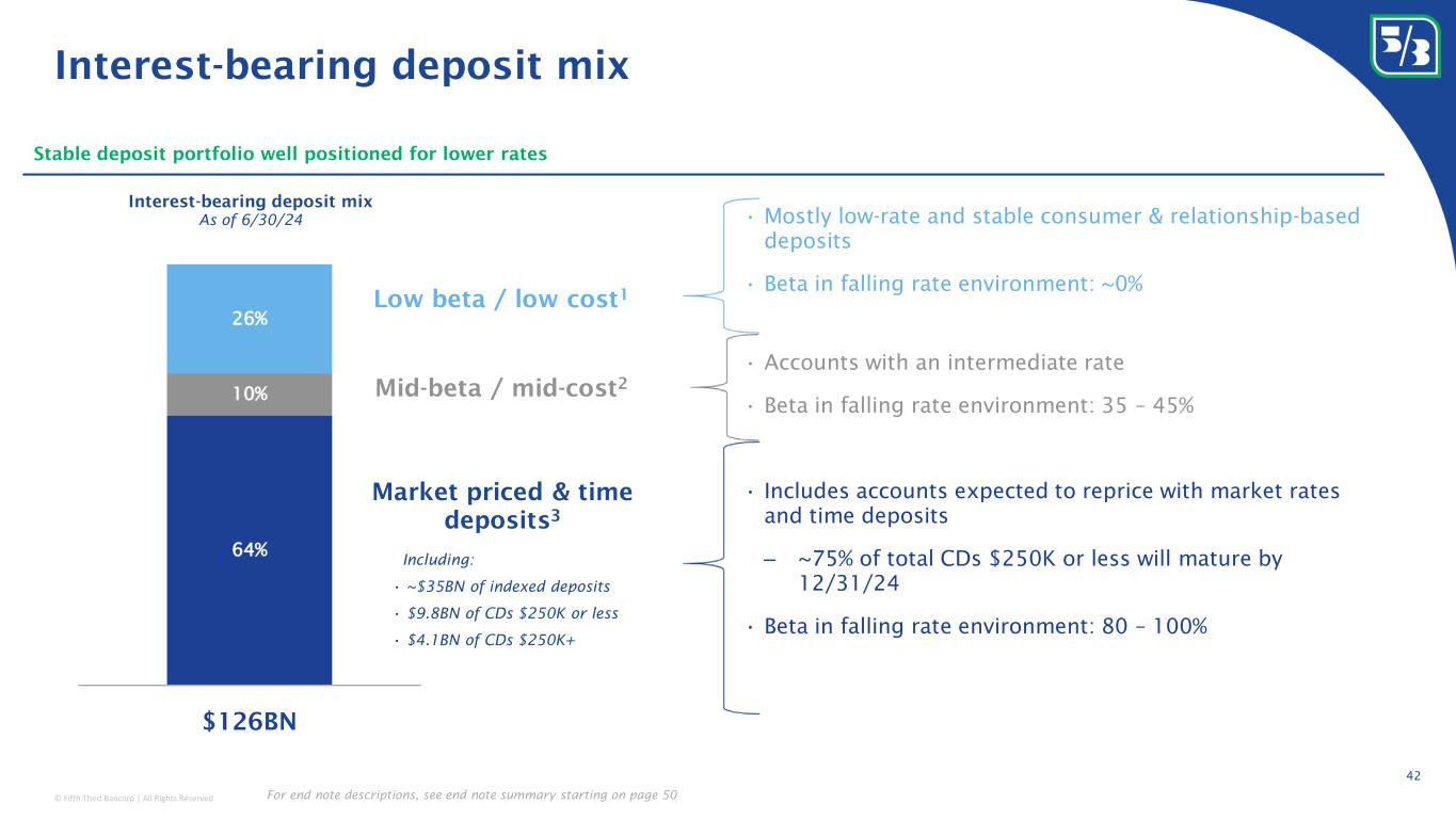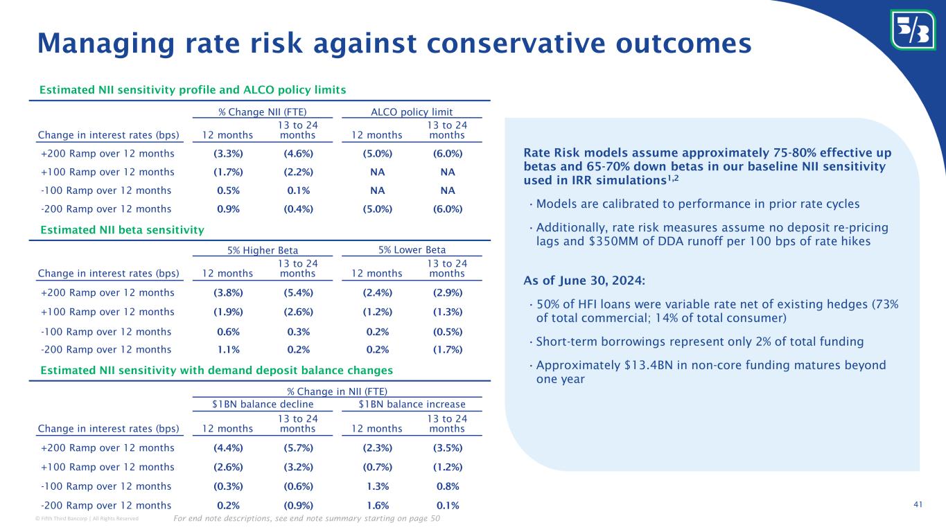 © Fifth Third Bancorp | All Rights Reserved Managing rate risk against conservative outcomes Estimated NII sensitivity profile and ALCO policy limits Estimated NII beta sensitivity Rate Risk models assume approximately 75-80% effective up betas and 65-70% down betas in our baseline NII sensitivity used in IRR simulations 1,2 •Models are calibrated to performance in prior rate cycles •Additionally, rate risk measures assume no deposit re-pricing lags and $350MM of DDA runoff per 100 bps of rate hikes As of June 30, 2024: •50% of HFI loans were variable rate net of existing hedges (73% of total commercial; 14% of total consumer) •Short-term borrowings represent only 2% of total funding •Approximately $13.4BN in non-core funding matures beyond one year 41 % Change NII (FTE) ALCO policy limit Change in interest rates (bps) 12 months 13 to 24 months 12 months 13 to 24 months +200 Ramp over 12 months (3.3%) (4.6%) (5.0%) (6.0%) +100 Ramp over 12 months (1.7%) (2.2%) NA NA -100 Ramp over 12 months 0.5% 0.1% NA NA -200 Ramp over 12 months 0.9% (0.4%) (5.0%) (6.0%) 5% Higher Beta 5% Lower Beta Change in interest rates (bps) 12 months 13 to 24 months 12 months 13 to 24 months +200 Ramp over 12 months (3.8%) (5.4%) (2.4%) (2.9%) +100 Ramp over 12 months (1.9%) (2.6%) (1.2%) (1.3%) -100 Ramp over 12 months 0.6% 0.3% 0.2% (0.5%) -200 Ramp over 12 months 1.1% 0.2% 0.2% (1.7%) Estimated NII sensitivity with demand deposit balance changes % Change in NII (FTE) $1BN balance decline $1BN balance increase Change in interest rates (bps) 12 months 13 to 24 months 12 months 13 to 24 months +200 Ramp over 12 months (4.4%) (5.7%) (2.3%) (3.5%) +100 Ramp over 12 months (2.6%) (3.2%) (0.7%) (1.2%) -100 Ramp over 12 months (0.3%) (0.6%) 1.3% 0.8% -200 Ramp over 12 months 0.2% (0.9%) 1.6% 0.1% For end note descriptions, see end note summary starting on page 50