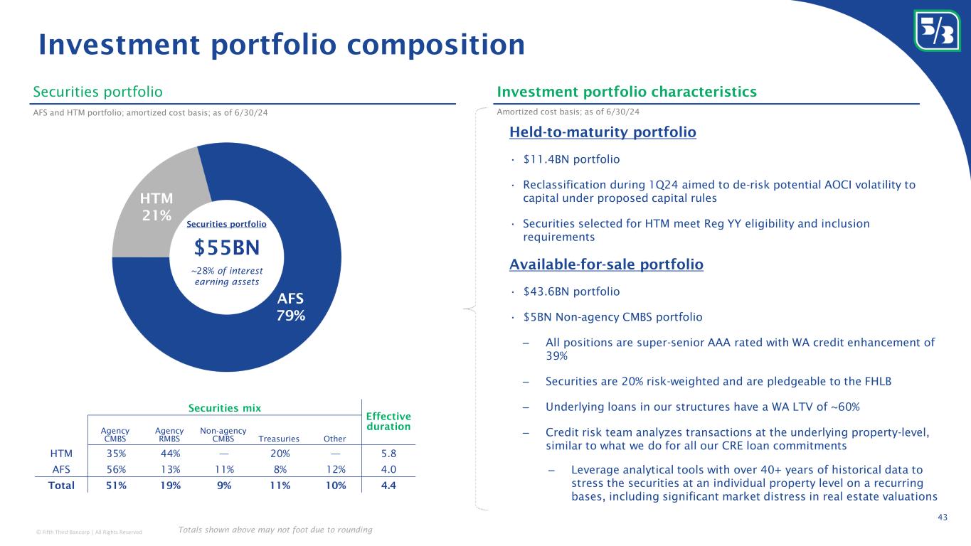 © Fifth Third Bancorp | All Rights Reserved 43 Investment portfolio composition Investment portfolio characteristics Held-to-maturity portfolio • $11.4BN portfolio • Reclassification during 1Q24 aimed to de-risk potential AOCI volatility to capital under proposed capital rules • Securities selected for HTM meet Reg YY eligibility and inclusion requirements Available-for-sale portfolio • $43.6BN portfolio • $5BN Non-agency CMBS portfolio ‒ All positions are super-senior AAA rated with WA credit enhancement of 39% ‒ Securities are 20% risk-weighted and are pledgeable to the FHLB ‒ Underlying loans in our structures have a WA LTV of ~60% ‒ Credit risk team analyzes transactions at the underlying property-level, similar to what we do for all our CRE loan commitments HTM 21% AFS 79% AFS and HTM portfolio; amortized cost basis; as of 6/30/24 Amortized cost basis; as of 6/30/24 Securities mix Effective duration Agency CMBS Agency RMBS Non-agency CMBS Treasuries Other HTM 35% 44% — 20% — 5.8 AFS 56% 13% 11% 8% 12% 4.0 Total 51% 19% 9% 11% 10% 4.4 Securities portfolio Securities portfolio $55BN ~28% of interest earning assets ‒ Leverage analytical tools with over 40+ years of historical data to stress the securities at an individual property level on a recurring bases, including significant market distress in real estate valuations Totals shown above may not foot due to rounding
