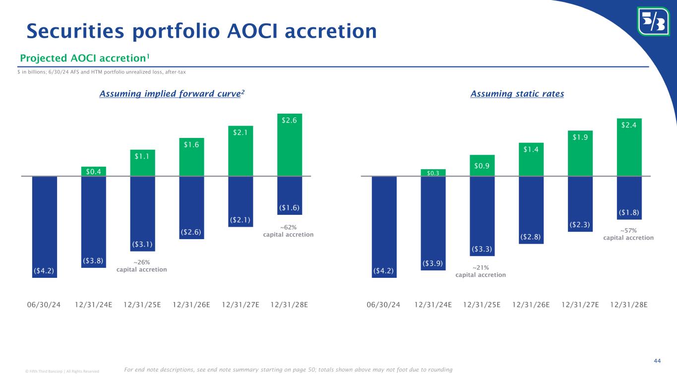 Classification: Internal Use © Fifth Third Bancorp | All Rights Reserved Securities portfolio AOCI accretion 44 Projected AOCI accretion 1 $ in billions; 6/30/24 AFS and HTM portfolio unrealized loss, after-tax For end note descriptions, see end note summary starting on page 50; totals shown above may not foot due to rounding ~62% capital accretion ~26% capital accretion Assuming implied forward curve 2 Assuming static rates ~57% capital accretion ~21% capital accretion