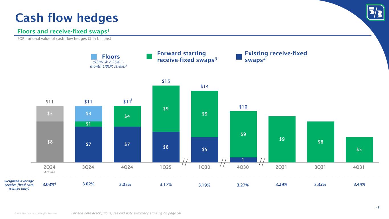 © Fifth Third Bancorp | All Rights Reserved Cash flow hedges ($3BN @ 2.25% 1- month LIBOR strike) 2 Floors and receive-fixed swaps 1 EOP notional value of cash flow hedges ($ in billions) Actual For end note descriptions, see end note summary starting on page 50 45 Floors Forward starting receive-fixed swaps 3 Existing receive-fixed swaps 4 weighted average receive fixed rate (swaps only) 3.32%3.05%3.02% 3.17% 3.19% 3.27% 3.29% 3.44% 5 3.03% 6