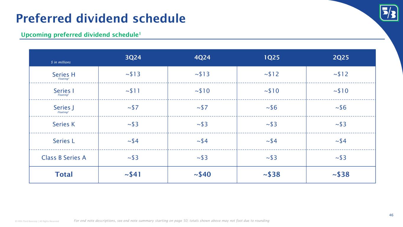 © Fifth Third Bancorp | All Rights Reserved Preferred dividend schedule 3Q24 4Q24 1Q25 2Q25 Series H ~$13 ~$13 ~$12 ~$12 Series I ~$11 ~$10 ~$10 ~$10 Series J ~$7 ~$7 ~$6 ~$6 Series K ~$3 ~$3 ~$3 ~$3 Series L ~$4 ~$4 ~$4 ~$4 Class B Series A ~$3 ~$3 ~$3 ~$3 Total ~$41 ~$40 ~$38 ~$38 Upcoming preferred dividend schedule 1 $ in millions For end note descriptions, see end note summary starting on page 50; totals shown above may not foot due to rounding 46 Floating 2 Floating 2 Floating 2