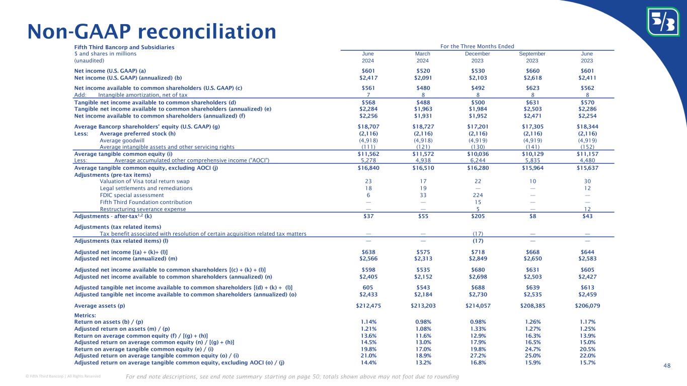 © Fifth Third Bancorp | All Rights Reserved For end note descriptions, see end note summary starting on page 50; totals shown above may not foot due to rounding 48 Fifth Third Bancorp and Subsidiaries For the Three Months Ended $ and shares in millions June March December September June (unaudited) 2024 2024 2023 2023 2023 Net income (U.S. GAAP) (a) $601 $520 $530 $660 $601 Net income (U.S. GAAP) (annualized) (b) $2,417 $2,091 $2,103 $2,618 $2,411 Net income available to common shareholders (U.S. GAAP) (c) $561 $480 $492 $623 $562 Add: Intangible amortization, net of tax 7 8 8 8 8 Tangible net income available to common shareholders (d) $568 $488 $500 $631 $570 Tangible net income available to common shareholders (annualized) (e) $2,284 $1,963 $1,984 $2,503 $2,286 Net income available to common shareholders (annualized) (f) $2,256 $1,931 $1,952 $2,471 $2,254 Average Bancorp shareholders' equity (U.S. GAAP) (g) $18,707 $18,727 $17,201 $17,305 $18,344 Less: Average preferred stock (h) (2,116) (2,116) (2,116) (2,116) (2,116) Average goodwill (4,918) (4,918) (4,919) (4,919) (4,919) Average intangible assets and other servicing rights (111) (121) (130) (141) (152) Average tangible common equity (i) $11,562 $11,572 $10,036 $10,129 $11,157 Less: Average accumulated other comprehensive income ("AOCI") 5,278 4,938 6,244 5,835 4,480 Average tangible common equity, excluding AOCI (j) $16,840 $16,510 $16,280 $15,964 $15,637 Adjustments (pre-tax items) Valuation of Visa total return swap 23 17 22 10 30 Legal settlements and remediations 18 19 — — 12 FDIC special assessment 6 33 224 — — Fifth Third Foundation contribution — — 15 — — Restructuring severance expense — — 5 — 12 Adjustments - after-tax 1,2 (k) $37 $55 $205 $8 $43 Adjustments (tax related items) Tax benefit associated with resolution of certain acquisition related tax matters — — (17) — — Adjustments (tax related items) (l) — — (17) — — Adjusted net income [(a) + (k)+ (l)] $638 $575 $718 $668 $644 Adjusted net income (annualized) (m) $2,566 $2,313 $2,849 $2,650 $2,583 Adjusted net income available to common shareholders [(c) + (k) + (l)] $598 $535 $680 $631 $605 Adjusted net income available to common shareholders (annualized) (n) $2,405 $2,152 $2,698 $2,503 $2,427 Adjusted tangible net income available to common shareholders [(d) + (k) + (l)] 605 $543 $688 $639 $613 Adjusted tangible net income available to common shareholders (annualized) (o) $2,433 $2,184 $2,730 $2,535 $2,459 Average assets (p) $212,475 $213,203 $214,057 $208,385 $206,079 Metrics: Return on assets (b) / (p) 1.14% 0.98% 0.98% 1.26% 1.17% Adjusted return on assets (m) / (p) 1.21% 1.08% 1.33% 1.27% 1.25% Return on average common equity (f) / [(g) + (h)] 13.6% 11.6% 12.9% 16.3% 13.9% Adjusted return on average common equity (n) / [(g) + (h)] 14.5% 13.0% 17.9% 16.5% 15.0% Return on average tangible common equity (e) / (i) 19.8% 17.0% 19.8% 24.7% 20.5% Adjusted return on average tangible common equity (o) / (i) 21.0% 18.9% 27.2% 25.0% 22.0% Adjusted return on average tangible common equity, excluding AOCI (o) / (j) 14.4% 13.2% 16.8% 15.9% 15.7% Non-GAAP reconciliation