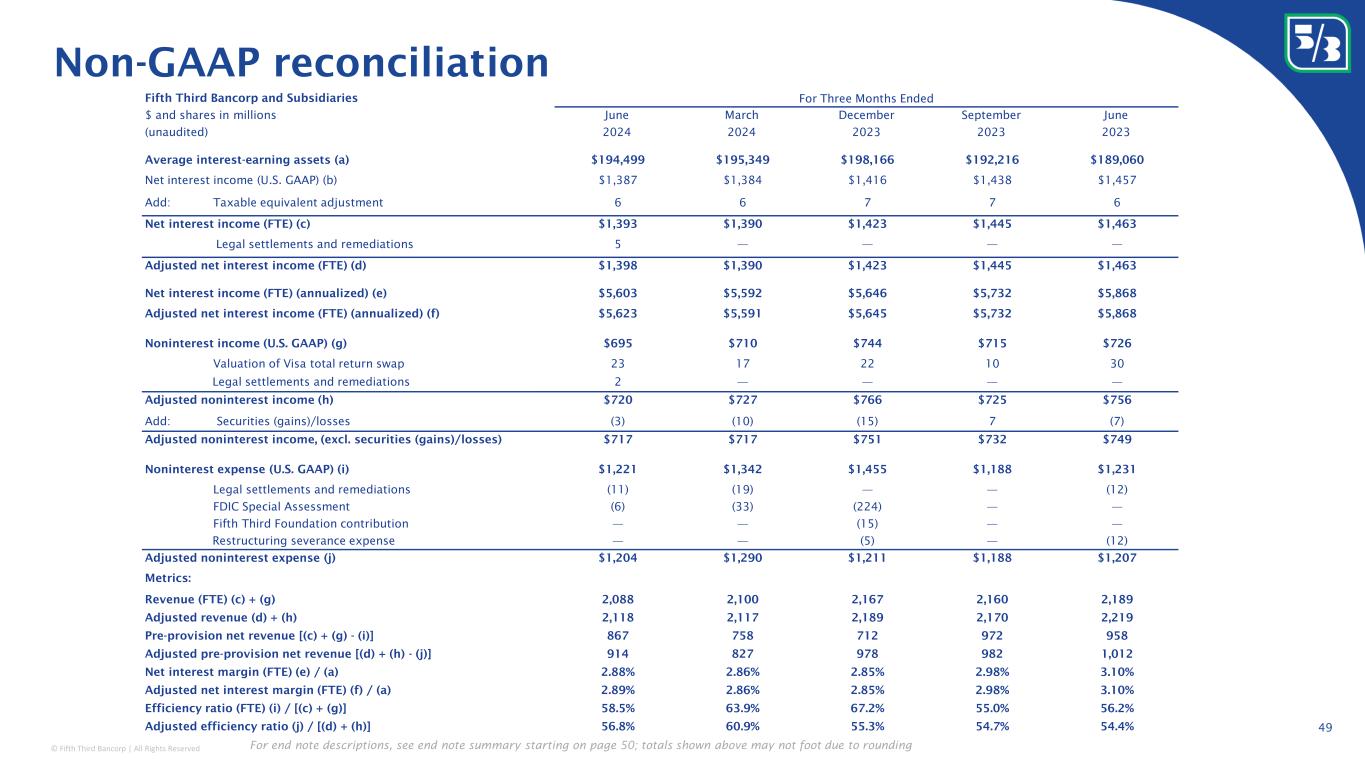 © Fifth Third Bancorp | All Rights Reserved Non-GAAP reconciliation For end note descriptions, see end note summary starting on page 50; totals shown above may not foot due to rounding 49 Fifth Third Bancorp and Subsidiaries For Three Months Ended $ and shares in millions June March December September June (unaudited) 2024 2024 2023 2023 2023 Average interest-earning assets (a) $194,499 $195,349 $198,166 $192,216 $189,060 Net interest income (U.S. GAAP) (b) $1,387 $1,384 $1,416 $1,438 $1,457 Add: Taxable equivalent adjustment 6 6 7 7 6 Net interest income (FTE) (c) $1,393 $1,390 $1,423 $1,445 $1,463 Legal settlements and remediations 5 — — — — Adjusted net interest income (FTE) (d) $1,398 $1,390 $1,423 $1,445 $1,463 Net interest income (FTE) (annualized) (e) $5,603 $5,592 $5,646 $5,732 $5,868 Adjusted net interest income (FTE) (annualized) (f) $5,623 $5,591 $5,645 $5,732 $5,868 Noninterest income (U.S. GAAP) (g) $695 $710 $744 $715 $726 Valuation of Visa total return swap 23 17 22 10 30 Legal settlements and remediations 2 — — — — Adjusted noninterest income (h) $720 $727 $766 $725 $756 Add: Securities (gains)/losses (3) (10) (15) 7 (7) Adjusted noninterest income, (excl. securities (gains)/losses) $717 $717 $751 $732 $749 Noninterest expense (U.S. GAAP) (i) $1,221 $1,342 $1,455 $1,188 $1,231 Legal settlements and remediations (11) (19) — — (12) FDIC Special Assessment (6) (33) (224) — — Fifth Third Foundation contribution — — (15) — — Restructuring severance expense — — (5) — (12) Adjusted noninterest expense (j) $1,204 $1,290 $1,211 $1,188 $1,207 Metrics: Revenue (FTE) (c) + (g) 2,088 2,100 2,167 2,160 2,189 Adjusted revenue (d) + (h) 2,118 2,117 2,189 2,170 2,219 Pre-provision net revenue [(c) + (g) - (i)] 867 758 712 972 958 Adjusted pre-provision net revenue [(d) + (h) - (j)] 914 827 978 982 1,012 Net interest margin (FTE) (e) / (a) 2.88% 2.86% 2.85% 2.98% 3.10% Adjusted net interest margin (FTE) (f) / (a) 2.89% 2.86% 2.85% 2.98% 3.10% Efficiency ratio (FTE) (i) / [(c) + (g)] 58.5% 63.9% 67.2% 55.0% 56.2% Adjusted efficiency ratio (j) / [(d) + (h)] 56.8% 60.9% 55.3% 54.7% 54.4%