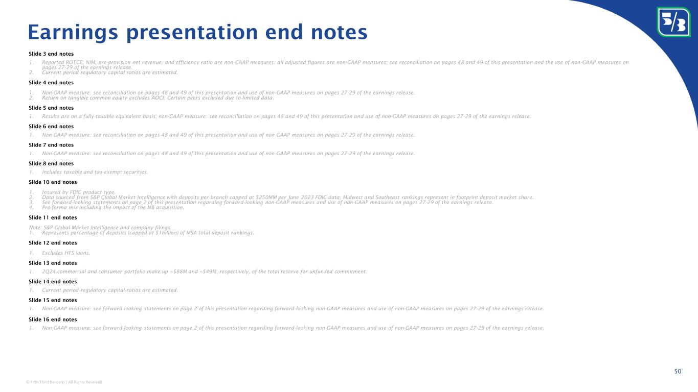 © Fifth Third Bancorp | All Rights Reserved Slide 3 end notes 1. Reported ROTCE, NIM, pre-provision net revenue, and efficiency ratio are non-GAAP measures: all adjusted figures are non-GAAP measures; see reconciliation on pages 48 and 49 of this presentation and the use of non-GAAP measures on pages 27-29 of the earnings release. 2. Current period regulatory capital ratios are estimated. Slide 4 end notes 1. Non-GAAP measure: see reconciliation on pages 48 and 49 of this presentation and use of non-GAAP measures on pages 27-29 of the earnings release. 2. Return on tangible common equity excludes AOCI; Certain peers excluded due to limited data. Slide 5 end notes 1. Results are on a fully-taxable equivalent basis; non-GAAP measure: see reconciliation on pages 48 and 49 of this presentation and use of non-GAAP measures on pages 27-29 of the earnings release. Slide 6 end notes 1. Non-GAAP measure: see reconciliation on pages 48 and 49 of this presentation and use of non-GAAP measures on pages 27-29 of the earnings release. Slide 7 end notes 1. Non-GAAP measure: see reconciliation on pages 48 and 49 of this presentation and use of non-GAAP measures on pages 27-29 of the earnings release. Slide 8 end notes 1. Includes taxable and tax-exempt securities. Slide 10 end notes 1. Insured by FDIC product type. 2. Data sourced from S&P Global Market Intelligence with deposits per branch capped at $250MM per June 2023 FDIC data; Midwest and Southeast rankings represent in footprint deposit market share. 3. See forward-looking statements on page 2 of this presentation regarding forward-looking non-GAAP measures and use of non-GAAP measures on pages 27-29 of the earnings release. 4. Pro-forma mix including the impact of the MB acquisition. Slide 11 end notes Note: S&P Global Market Intelligence and company filings. 1. Represents percentage of deposits (capped at $1billion) of MSA total deposit rankings. Slide 12 end notes 1. Excludes HFS loans. Slide 13 end notes 1. 2Q24 commercial and consumer portfolio make up ~$88M and ~$49M, respectively, of the total reserve for unfunded commitment. Slide 14 end notes 1. Current period regulatory capital ratios are estimated. Slide 15 end notes 1. Non-GAAP measure: see forward-looking statements on page 2 of this presentation regarding forward-looking non-GAAP measures and use of non-GAAP measures on pages 27-29 of the earnings release. Slide 16 end notes 1. Non-GAAP measure: see forward-looking statements on page 2 of this presentation regarding forward-looking non-GAAP measures and use of non-GAAP measures on pages 27-29 of the earnings release. 50 Earnings presentation end notes
