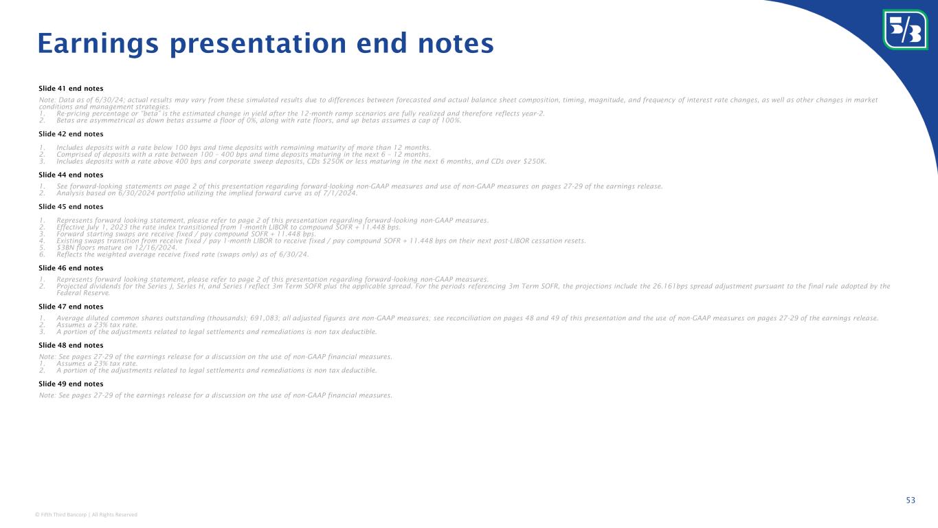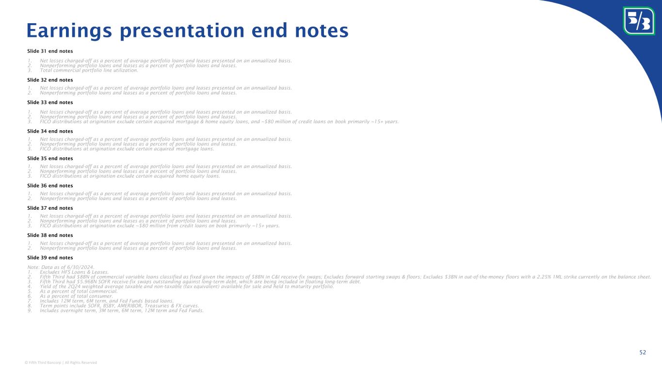© Fifth Third Bancorp | All Rights Reserved Slide 31 end notes 1. Net losses charged-off as a percent of average portfolio loans and leases presented on an annualized basis. 2. Nonperforming portfolio loans and leases as a percent of portfolio loans and leases. 3. Total commercial portfolio line utilization. Slide 32 end notes 1. Net losses charged-off as a percent of average portfolio loans and leases presented on an annualized basis. 2. Nonperforming portfolio loans and leases as a percent of portfolio loans and leases. Slide 33 end notes 1. Net losses charged-off as a percent of average portfolio loans and leases presented on an annualized basis. 2. Nonperforming portfolio loans and leases as a percent of portfolio loans and leases. 3. FICO distributions at origination exclude certain acquired mortgage & home equity loans, and ~$80 million of credit loans on book primarily ~15+ years. Slide 34 end notes 1. Net losses charged-off as a percent of average portfolio loans and leases presented on an annualized basis. 2. Nonperforming portfolio loans and leases as a percent of portfolio loans and leases. 3. FICO distributions at origination exclude certain acquired mortgage loans. Slide 35 end notes 1. Net losses charged-off as a percent of average portfolio loans and leases presented on an annualized basis. 2. Nonperforming portfolio loans and leases as a percent of portfolio loans and leases. 3. FICO distributions at origination exclude certain acquired home equity loans. Slide 36 end notes 1. Net losses charged-off as a percent of average portfolio loans and leases presented on an annualized basis. 2. Nonperforming portfolio loans and leases as a percent of portfolio loans and leases. Slide 37 end notes 1. Net losses charged-off as a percent of average portfolio loans and leases presented on an annualized basis. 2. Nonperforming portfolio loans and leases as a percent of portfolio loans and leases. 3. FICO distributions at origination exclude ~$80 million from credit loans on book primarily ~15+ years. Slide 38 end notes 1. Net losses charged-off as a percent of average portfolio loans and leases presented on an annualized basis. 2. Nonperforming portfolio loans and leases as a percent of portfolio loans and leases. Slide 39 end notes Note: Data as of 6/30/2024. 1. Excludes HFS Loans & Leases. 2. Fifth Third had $8BN of commercial variable loans classified as fixed given the impacts of $8BN in C&I receive-fix swaps; Excludes forward starting swaps & floors; Excludes $3BN in out-of-the-money floors with a 2.25% 1ML strike currently on the balance sheet. 3. Fifth Third had $5.96BN SOFR receive-fix swaps outstanding against long-term debt, which are being included in floating long-term debt. 4. Yield of the 2Q24 weighted average taxable and non-taxable (tax equivalent) available for sale and held to maturity portfolio. 5. As a percent of total commercial. 6. As a percent of total consumer. 7. Includes 12M term, 6M term, and Fed Funds based loans. 8. Term points include SOFR, BSBY, AMERIBOR, Treasuries & FX curves. 9. Includes overnight term, 3M term, 6M term, 12M term and Fed Funds. 52 Earnings presentation end notes