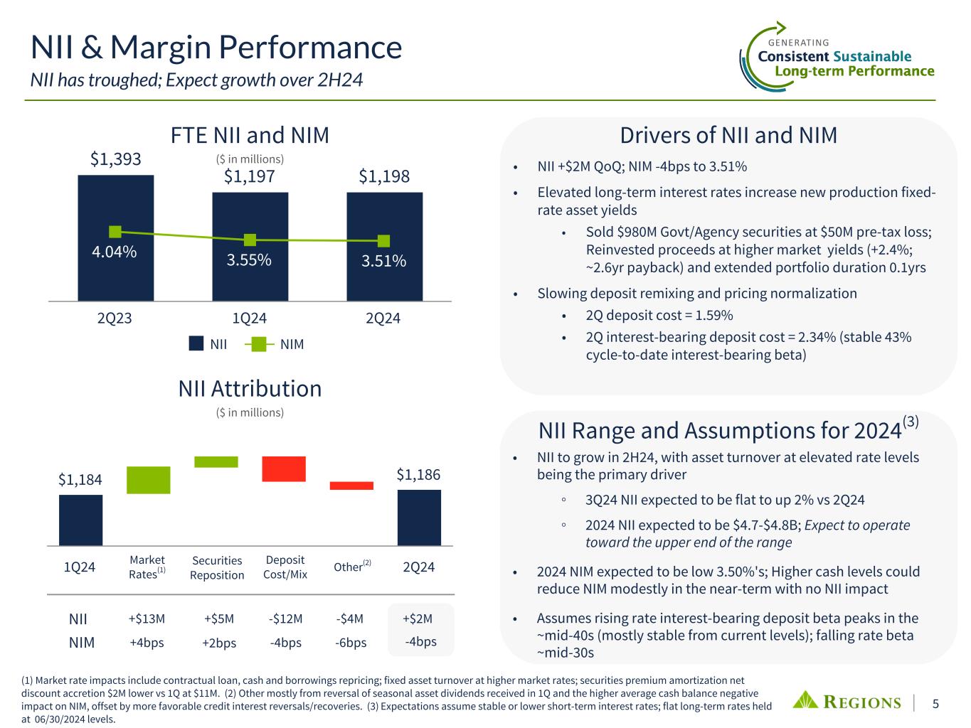 “Our teams delivered solid second quarter results driven by the successful execution of Regions' business strategies. We have a great plan, and the investments we are making in talent, technology, products and services will continue to benefit us as macroeconomic conditions improve," said John Turner, Chairman, President and CEO of Regions Financial Corp.