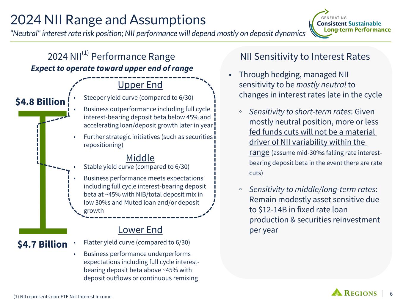 6 • Flatter yield curve (compared to 6/30) • Business performance underperforms expectations including full cycle interest- bearing deposit beta above ~45% with deposit outflows or continuous remixing 2024 NII Range and Assumptions "Neutral" interest rate risk position; NII performance will depend mostly on deposit dynamics (1) NII represents non-FTE Net Interest Income. 2024 NII(1) Performance Range NII Sensitivity to Interest Rates $4.8 Billion $4.7 Billion Upper End Lower End • Through hedging, managed NII sensitivity to be mostly neutral to changes in interest rates late in the cycle ◦ Sensitivity to short-term rates: Given mostly neutral position, more or less fed funds cuts will not be a material driver of NII variability within the range (assume mid-30%s falling rate interest- bearing deposit beta in the event there are rate cuts) ◦ Sensitivity to middle/long-term rates: Remain modestly asset sensitive due to $12-14B in fixed rate loan production & securities reinvestment per year Middle Expect to operate toward upper end of range • Steeper yield curve (compared to 6/30) • Business outperformance including full cycle interest-bearing deposit beta below 45% and accelerating loan/deposit growth later in year • Further strategic initiatives (such as securities repositioning) • Stable yield curve (compared to 6/30) • Business performance meets expectations including full cycle interest-bearing deposit beta at ~45% with NIB/total deposit mix in low 30%s and Muted loan and/or deposit growth