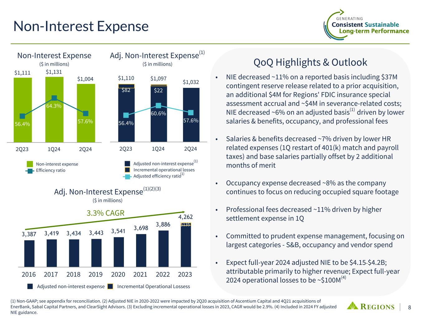 7 $576 $613 $595 2Q23 1Q24 2Q24 ($ in millions) Change vs 2Q24 1Q24 2Q23 Service charges $151 2.0% (0.7)% Card and ATM fees 120 3.4% (7.7)% Wealth management income 122 2.5% 10.9% Capital markets (Ex CVA/DVA) 70 (24.7)% (9.1)% Mortgage income 34 (17.1)% 30.8% Non-Interest Income (1) Non-GAAP; see appendix for reconciliation. RECMs - Real Estate Capital Markets; DCMs - Debt Capital Markets • NIR decreased ~3% on a reported basis and included $50M pre-tax loss on securities repositioning in both 1Q and 2Q; NIR decreased ~3% on an adjusted(1) basis • Service charges increased ~2% primarily due to 1 additional business day in 2Q • Card & ATM fees increased ~3% attributable to higher debit & credit card transaction volumes • Capital markets income decreased ~25%; Ex. CVA/DVA also decreased ~25% driven by decreased M&A, RECMs and DCMs activity from better levels experienced in 1Q • Wealth Management generated record revenue increasing ~3% driven by increased sales activity and continued strength in financial markets • Mortgage income decreased ~17% driven by $6M favorable adjustment to Regions' mortgage pipeline valuation in 1Q which did not repeat in 2Q • Other NIR increased ~21% attributable primarily to negative valuation adjustments on certain equity investments in 1Q that did not repeat in 2Q • Expect full-year 2024 adjusted non-interest income to be at the upper end of the $2.3-$2.4B range $576 $563 $545 2Q23 1Q24 2Q24 Non-Interest Income ($ in millions) Adj. Non-Interest Income(1) ($ in millions) QoQ Highlights & Outlook