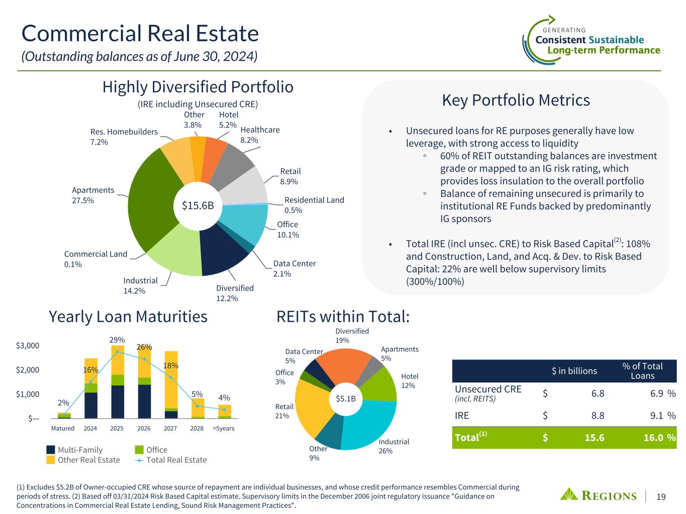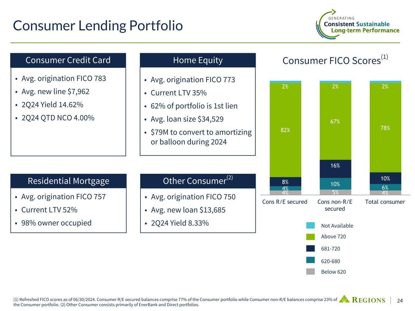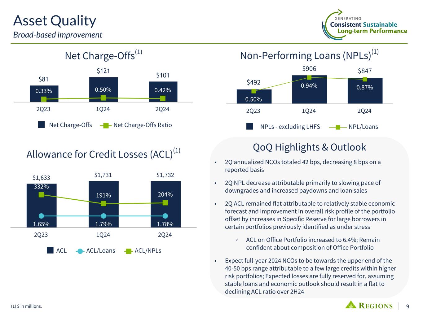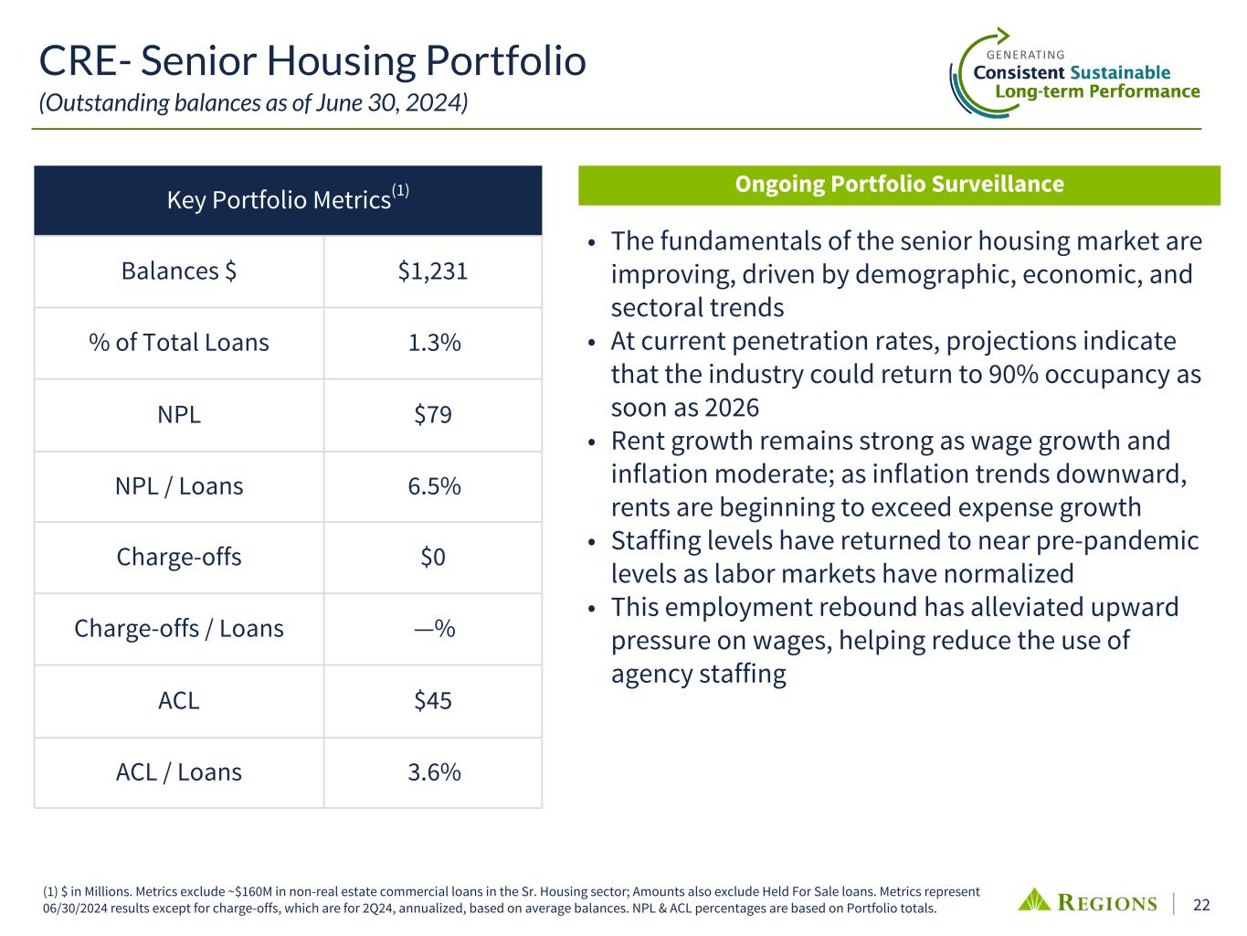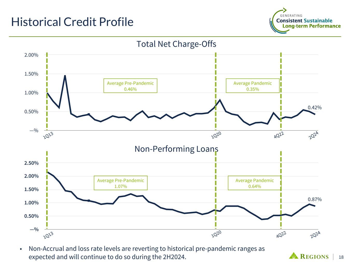 (2)Excludes loans that are 100% guaranteed by FHA and all guaranteed loans sold to Ginnie Mae where Regions has the right but not the obligation to repurchase. Total 90 days or more past due guaranteed loans excluded were $40 million at 6/30/2024, $44 million at 3/31/2024, $34 million at 12/31/2023, $23 million at 9/30/2023, and $24 million at 6/30/2023.