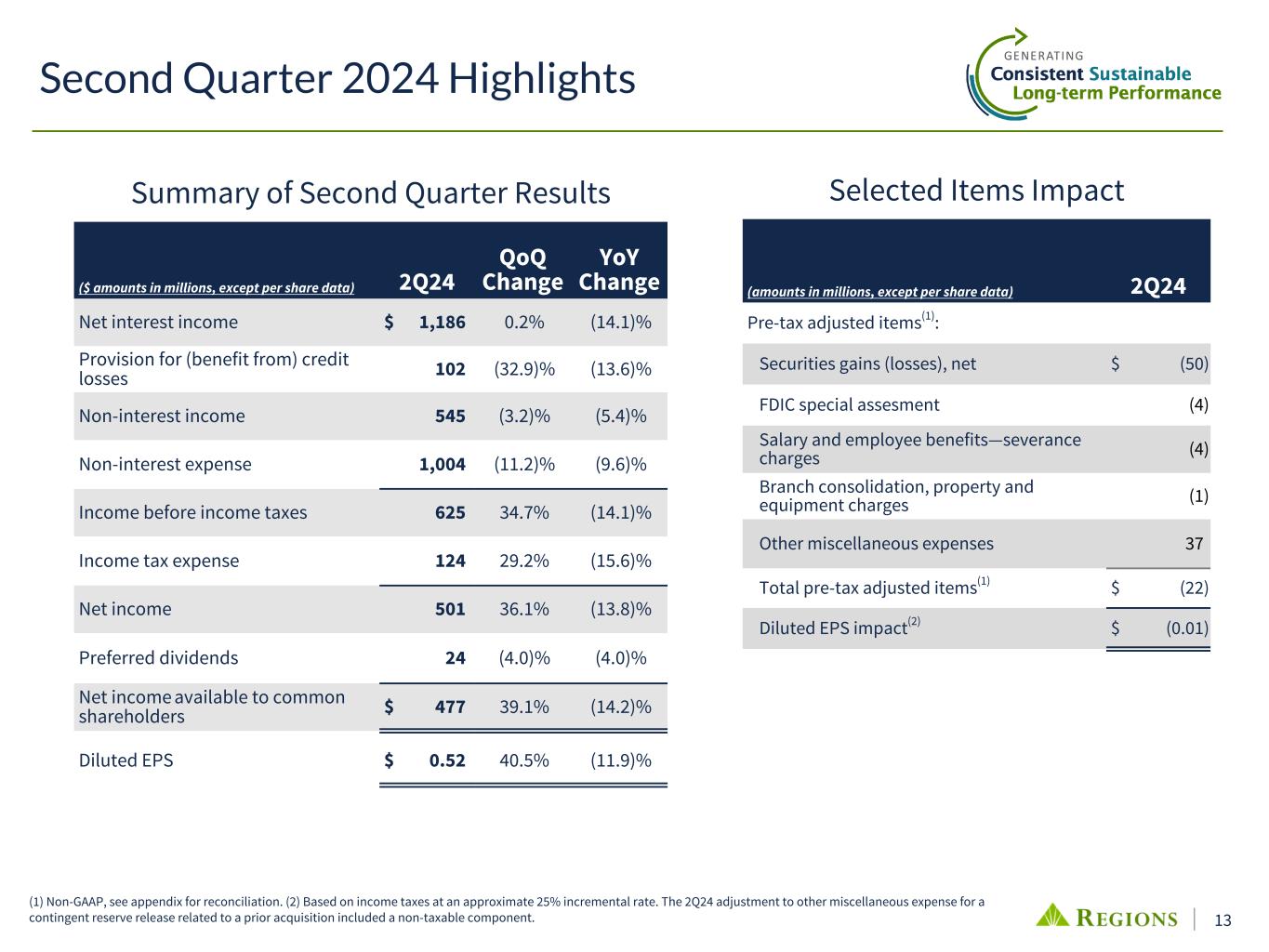 BIRMINGHAM, Ala. - (BUSINESS WIRE) - July 19, 2024 - Regions Financial Corp. (NYSE:RF) today reported earnings for the second quarter ended June 30, 2024. The company reported second quarter net income available to common shareholders of $477 million and earnings per diluted share of $0.52. The company reported $1.7 billion in total revenue during the quarter, including $727 million in reported pre-tax pre-provision income(1) and $749 million in adjusted pre-tax pre-provision income(1). Second quarter results include the following notable items: an addition to the industry-wide FDIC special assessment accrual, severance-related charges, a contingent reserve release related to a prior acquisition, and the impact of additional securities repositioning.