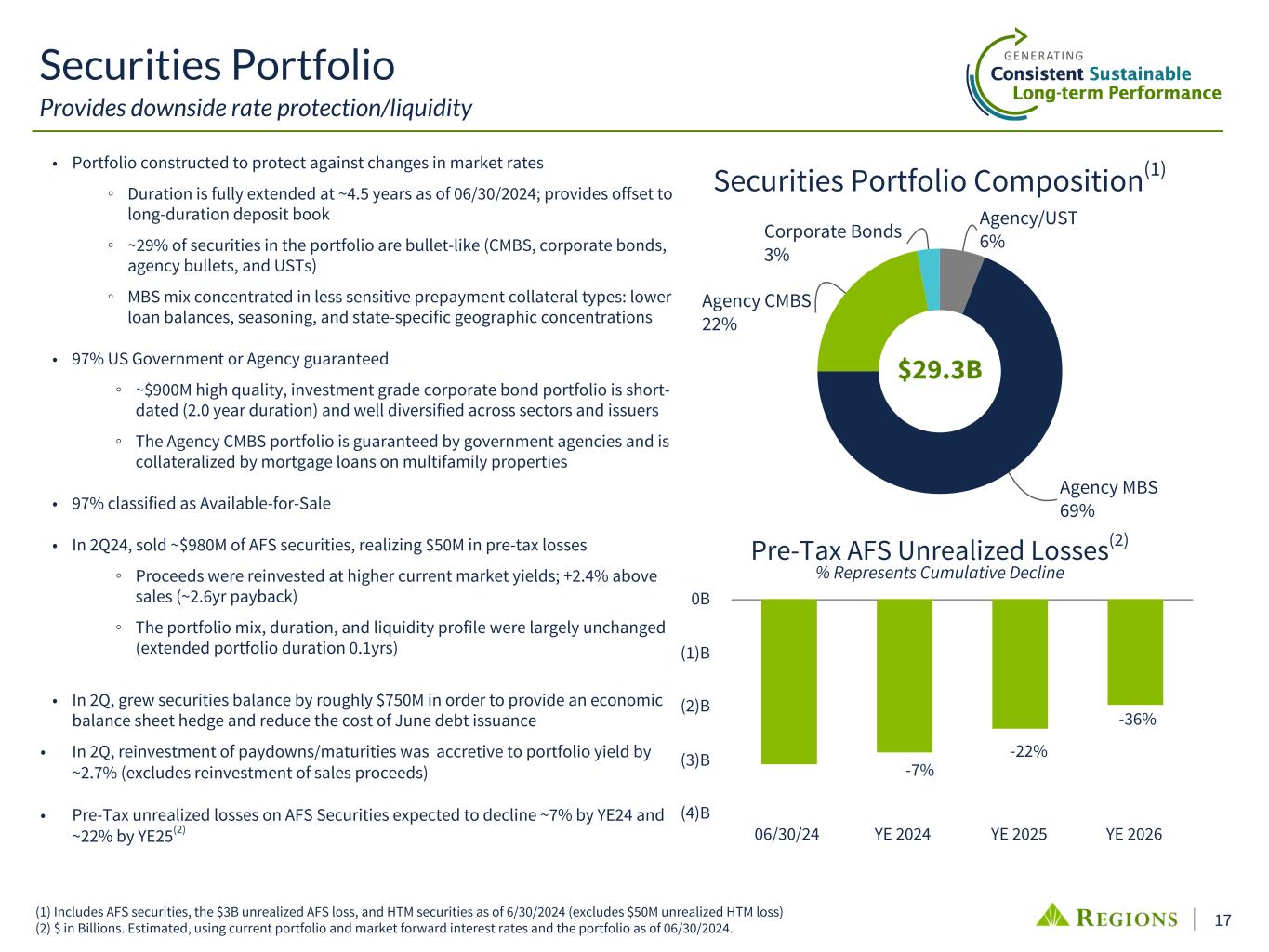 16 Notional Fixed Rate Maturity AFS Securities(3) $1.3B 4.8% 0.9 years Debt(3) (4) $1.4B 0.6% 2.3 years Time Deposits(3) $0.3B 5.0% 0.4 years 1 2 3 4 Cash Flow Hedge Notional(1) (1) Floating rate leg of swaps vs overnight SOFR. (2) Collars use short interest rate caps to pay for long interest rate floors; weighted avg. floor of 1.86%, weighted avg. cap of 6.22%. (3) Fair value hedges on securities pay fixed; fair value hedges on debt and time deposits receive fixed. (4) Excludes forward-starting fair value swap on Q2 2024 debt issuance. (Quarterly Avg) 1 2 3 4 5 6 2.86% 2.92% 2.95% 3.03% 3.18% 3.59% 3.63% 2024 2025 2026 2027 2028 2029 2030 $19.9B $19.0B $16.9B $14.2B $8.6B $2.6B $2.0B - - - - +$0.5B +$1.0B +$1.0B $19.9B $19.0B $16.9B $14.2B $9.1B $3.6B $3.0B (Annual Avg) as of 6/30/2024 2Q24 3Q24 4Q24 1Q25 Swap Notional - 1Q24 $20.6B $19.6B $19.0B $19.6B 2Q24 Swap Changes - - - - Swap Notional - 2Q24 $20.6B $19.6B $19.0B $19.6B Swaps Swap Receive Rate(1) 2.83% 2.85% 2.85% $1.0B $2.0B $2.0B $2.0B $1.0B $0.0B $0.0BCollar Notional(2) $0.5B $1.5B $1.5B $2.0B Collars Hedging Strategy Update Creates mostly "neutral" interest rate risk position with well-protected margin in 3.50%s Fair Value Swaps(1) 2Q 2024 Activity Cash Flow Hedging - Hedges in place provide a well protected sensitivity profile in the near-term. Focused on opportunistically adding protection in outer years • Added $1B in forward-starting (July '28), 3-year receive- fixed swaps (3.83%)
