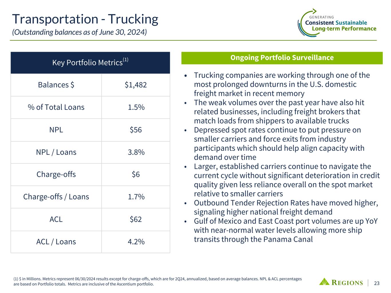 23 Transportation - Trucking (Outstanding balances as of June 30, 2024) (1) $ in Millions. Metrics represent 06/30/2024 results except for charge-offs, which are for 2Q24, annualized, based on average balances. NPL & ACL percentages are based on Portfolio totals. Metrics are inclusive of the Ascentium portfolio. Key Portfolio Metrics(1) Balances $ $1,482 % of Total Loans 1.5% NPL $56 NPL / Loans 3.8% Charge-offs $6 Charge-offs / Loans 1.7% ACL $62 ACL / Loans 4.2% • Trucking companies are working through one of the most prolonged downturns in the U.S. domestic freight market in recent memory • The weak volumes over the past year have also hit related businesses, including freight brokers that match loads from shippers to available trucks • Depressed spot rates continue to put pressure on smaller carriers and force exits from industry participants which should help align capacity with demand over time • Larger, established carriers continue to navigate the current cycle without significant deterioration in credit quality given less reliance overall on the spot market relative to smaller carriers • Outbound Tender Rejection Rates have moved higher, signaling higher national freight demand • Gulf of Mexico and East Coast port volumes are up YoY with near-normal water levels allowing more ship transits through the Panama Canal Ongoing Portfolio Surveillance
