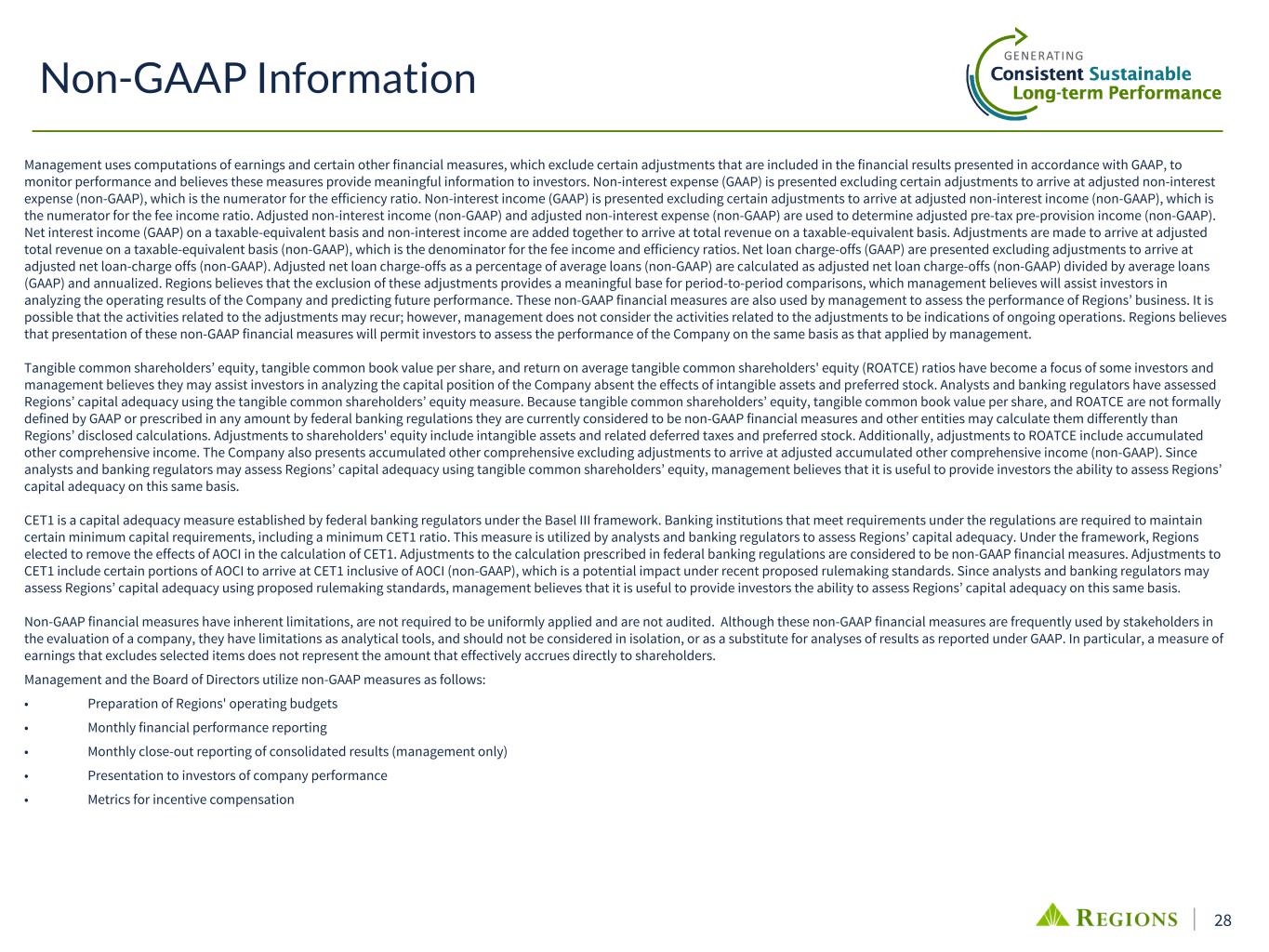 28 Management uses computations of earnings and certain other financial measures, which exclude certain adjustments that are included in the financial results presented in accordance with GAAP, to monitor performance and believes these measures provide meaningful information to investors. Non-interest expense (GAAP) is presented excluding certain adjustments to arrive at adjusted non-interest expense (non-GAAP), which is the numerator for the efficiency ratio. Non-interest income (GAAP) is presented excluding certain adjustments to arrive at adjusted non-interest income (non-GAAP), which is the numerator for the fee income ratio. Adjusted non-interest income (non-GAAP) and adjusted non-interest expense (non-GAAP) are used to determine adjusted pre-tax pre-provision income (non-GAAP). Net interest income (GAAP) on a taxable-equivalent basis and non-interest income are added together to arrive at total revenue on a taxable-equivalent basis. Adjustments are made to arrive at adjusted total revenue on a taxable-equivalent basis (non-GAAP), which is the denominator for the fee income and efficiency ratios. Net loan charge-offs (GAAP) are presented excluding adjustments to arrive at adjusted net loan-charge offs (non-GAAP). Adjusted net loan charge-offs as a percentage of average loans (non-GAAP) are calculated as adjusted net loan charge-offs (non-GAAP) divided by average loans (GAAP) and annualized. Regions believes that the exclusion of these adjustments provides a meaningful base for period-to-period comparisons, which management believes will assist investors in analyzing the operating results of the Company and predicting future performance. These non-GAAP financial measures are also used by management to assess the performance of Regions’ business. It is possible that the activities related to the adjustments may recur; however, management does not consider the activities related to the adjustments to be indications of ongoing operations. Regions believes that presentation of these non-GAAP financial measures will permit investors to assess the performance of the Company on the same basis as that applied by management. Tangible common shareholders’ equity, tangible common book value per share, and return on average tangible common shareholders' equity (ROATCE) ratios have become a focus of some investors and management believes they may assist investors in analyzing the capital position of the Company absent the effects of intangible assets and preferred stock. Analysts and banking regulators have assessed Regions’ capital adequacy using the tangible common shareholders’ equity measure. Because tangible common shareholders’ equity, tangible common book value per share, and ROATCE are not formally defined by GAAP or prescribed in any amount by federal banking regulations they are currently considered to be non-GAAP financial measures and other entities may calculate them differently than Regions’ disclosed calculations. Adjustments to shareholders' equity include intangible assets and related deferred taxes and preferred stock. Additionally, adjustments to ROATCE include accumulated other comprehensive income. The Company also presents accumulated other comprehensive excluding adjustments to arrive at adjusted accumulated other comprehensive income (non-GAAP). Since analysts and banking regulators may assess Regions’ capital adequacy using tangible common shareholders’ equity, management believes that it is useful to provide investors the ability to assess Regions’ capital adequacy on this same basis. CET1 is a capital adequacy measure established by federal banking regulators under the Basel III framework. Banking institutions that meet requirements under the regulations are required to maintain certain minimum capital requirements, including a minimum CET1 ratio. This measure is utilized by analysts and banking regulators to assess Regions’ capital adequacy. Under the framework, Regions elected to remove the effects of AOCI in the calculation of CET1. Adjustments to the calculation prescribed in federal banking regulations are considered to be non-GAAP financial measures. Adjustments to CET1 include certain portions of AOCI to arrive at CET1 inclusive of AOCI (non-GAAP), which is a potential impact under recent proposed rulemaking standards. Since analysts and banking regulators may assess Regions’ capital adequacy using proposed rulemaking standards, management believes that it is useful to provide investors the ability to assess Regions’ capital adequacy on this same basis. Non-GAAP financial measures have inherent limitations, are not required to be uniformly applied and are not audited. Although these non-GAAP financial measures are frequently used by stakeholders in the evaluation of a company, they have limitations as analytical tools, and should not be considered in isolation, or as a substitute for analyses of results as reported under GAAP. In particular, a measure of earnings that excludes selected items does not represent the amount that effectively accrues directly to shareholders. Management and the Board of Directors utilize non-GAAP measures as follows: • Preparation of Regions' operating budgets • Monthly financial performance reporting • Monthly close-out reporting of consolidated results (management only) • Presentation to investors of company performance • Metrics for incentive compensation Non-GAAP Information