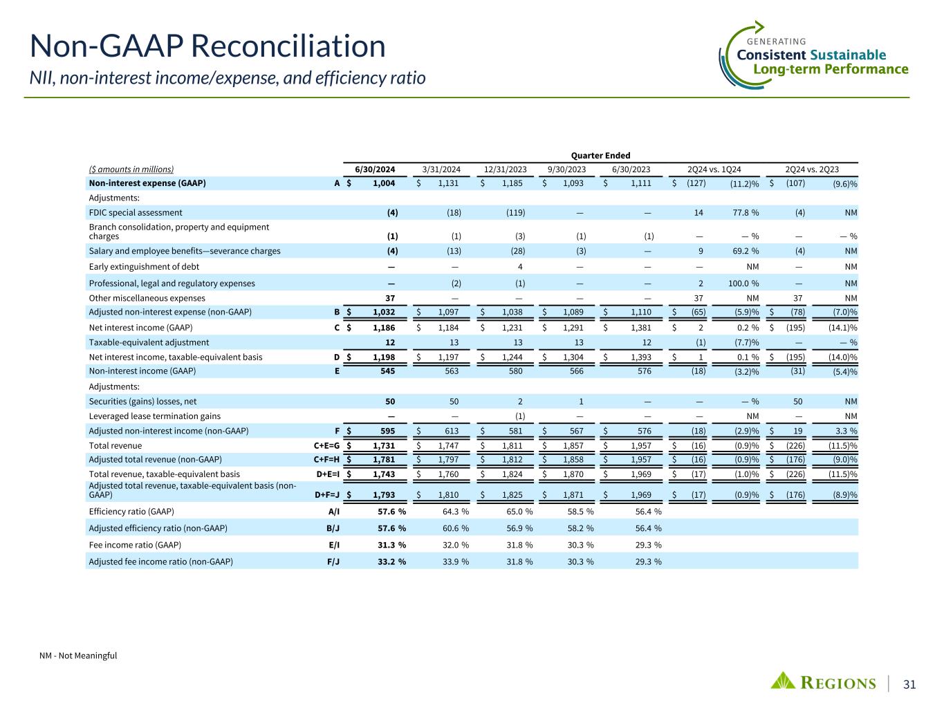 30 Non-GAAP Reconciliation Pre-tax Pre-Provision Income (PPI) Quarter Ended ($ amounts in millions) 6/30/2024 3/31/2024 12/31/2023 9/30/2023 6/30/2023 2Q24 vs. 1Q24 2Q24 vs. 2Q23 Net income available to common shareholders (GAAP) $ 477 $ 343 $ 367 $ 465 $ 556 $ 134 39.1 % $ (79) (14.2) % Preferred dividends (GAAP) 24 25 24 25 25 (1) (4.0) % (1) (4.0) % Income tax expense (GAAP) 124 96 80 129 147 28 29.2 % (23) (15.6) % Income before income taxes (GAAP) 625 464 471 619 728 161 34.7 % (103) (14.1) % Provision for credit losses (GAAP) 102 152 155 145 118 (50) (32.9) % (16) (13.6) % Pre-tax pre-provision income (non-GAAP) 727 616 626 764 846 111 18.0 % (119) (14.1) % Other adjustments: Securities (gains) losses, net 50 50 2 1 — — — % 50 NM Leveraged lease termination gains, net — — (1) — — — NM — NM FDIC special assessment 4 18 119 — — (14) (77.8) % 4 NM Salaries and employee benefits—severance charges 4 13 28 3 — (9) (69.2) % 4 NM Branch consolidation, property and equipment charges 1 1 3 1 1 — — % — — % Early extinguishment of debt — — (4) — — — NM — NM Other miscellaneous expenses (37) — — — — (37) NM (37) NM Professional, legal and regulatory expenses — 2 1 — — (2) (100.0) % — NM Total other adjustments 22 84 148 5 1 (62) (73.8) % 21 NM Adjusted pre-tax pre-provision income (non-GAAP) $ 749 $ 700 $ 774 $ 769 $ 847 $ 49 7.0 % $ (98) (11.6) % NM - Not Meaningful