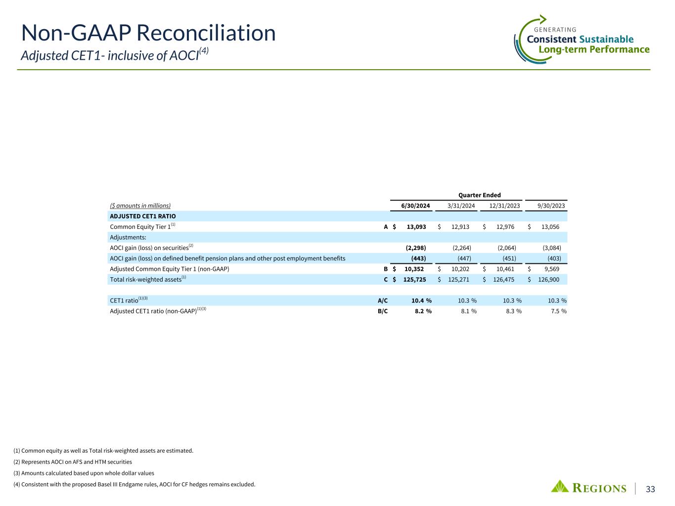 33 Quarter Ended ($ amounts in millions) 6/30/2024 3/31/2024 12/31/2023 9/30/2023 ADJUSTED CET1 RATIO Common Equity Tier 1(1) A $ 13,093 $ 12,913 $ 12,976 $ 13,056 Adjustments: AOCI gain (loss) on securities(2) (2,298) (2,264) (2,064) (3,084) AOCI gain (loss) on defined benefit pension plans and other post employment benefits (443) (447) (451) (403) Adjusted Common Equity Tier 1 (non-GAAP) B $ 10,352 $ 10,202 $ 10,461 $ 9,569 Total risk-weighted assets(1) C $ 125,725 $ 125,271 $ 126,475 $ 126,900 CET1 ratio(1)(3) A/C 10.4 % 10.3 % 10.3 % 10.3 % Adjusted CET1 ratio (non-GAAP)(1)(3) B/C 8.2 % 8.1 % 8.3 % 7.5 % Non-GAAP Reconciliation Adjusted CET1- inclusive of AOCI(4) (1) Common equity as well as Total risk-weighted assets are estimated. (2) Represents AOCI on AFS and HTM securities (3) Amounts calculated based upon whole dollar values (4) Consistent with the proposed Basel III Endgame rules, AOCI for CF hedges remains excluded.